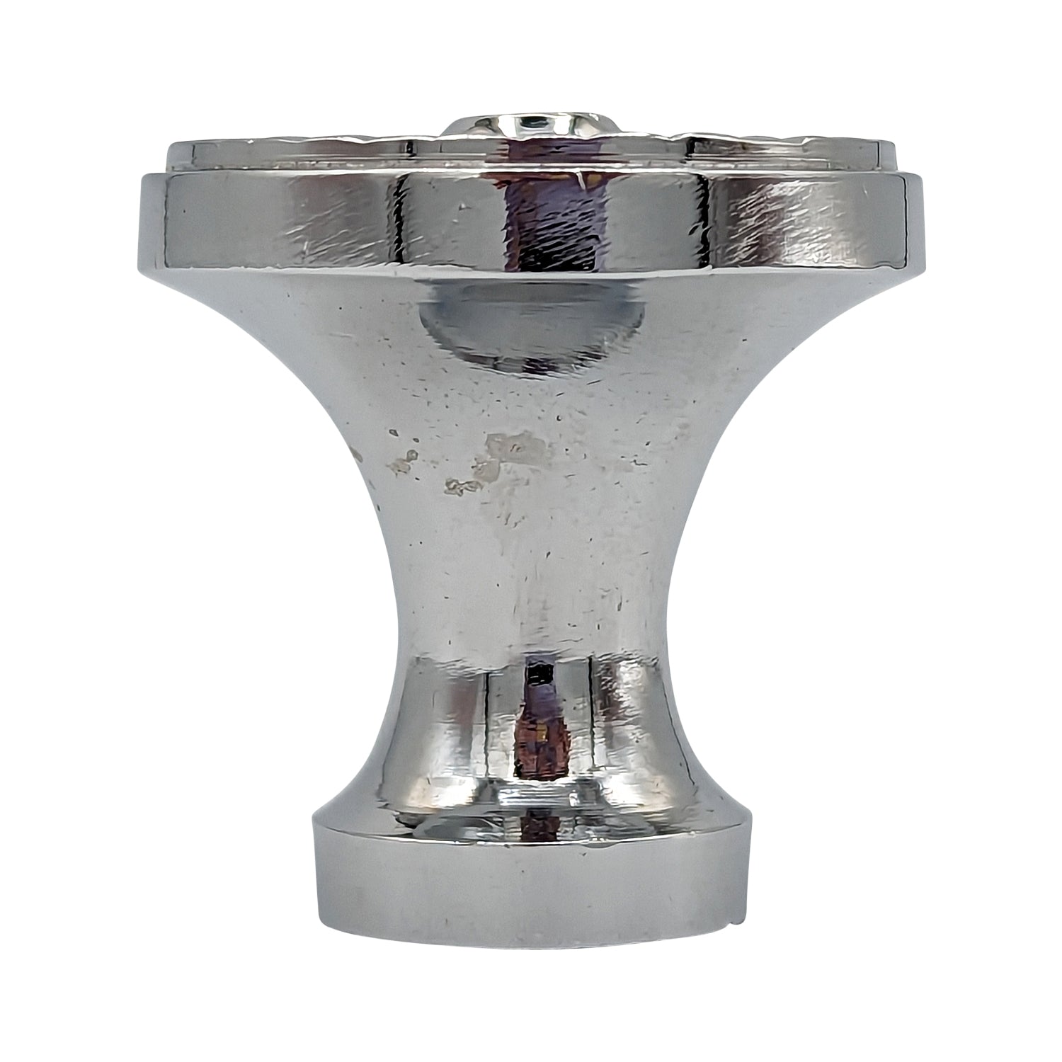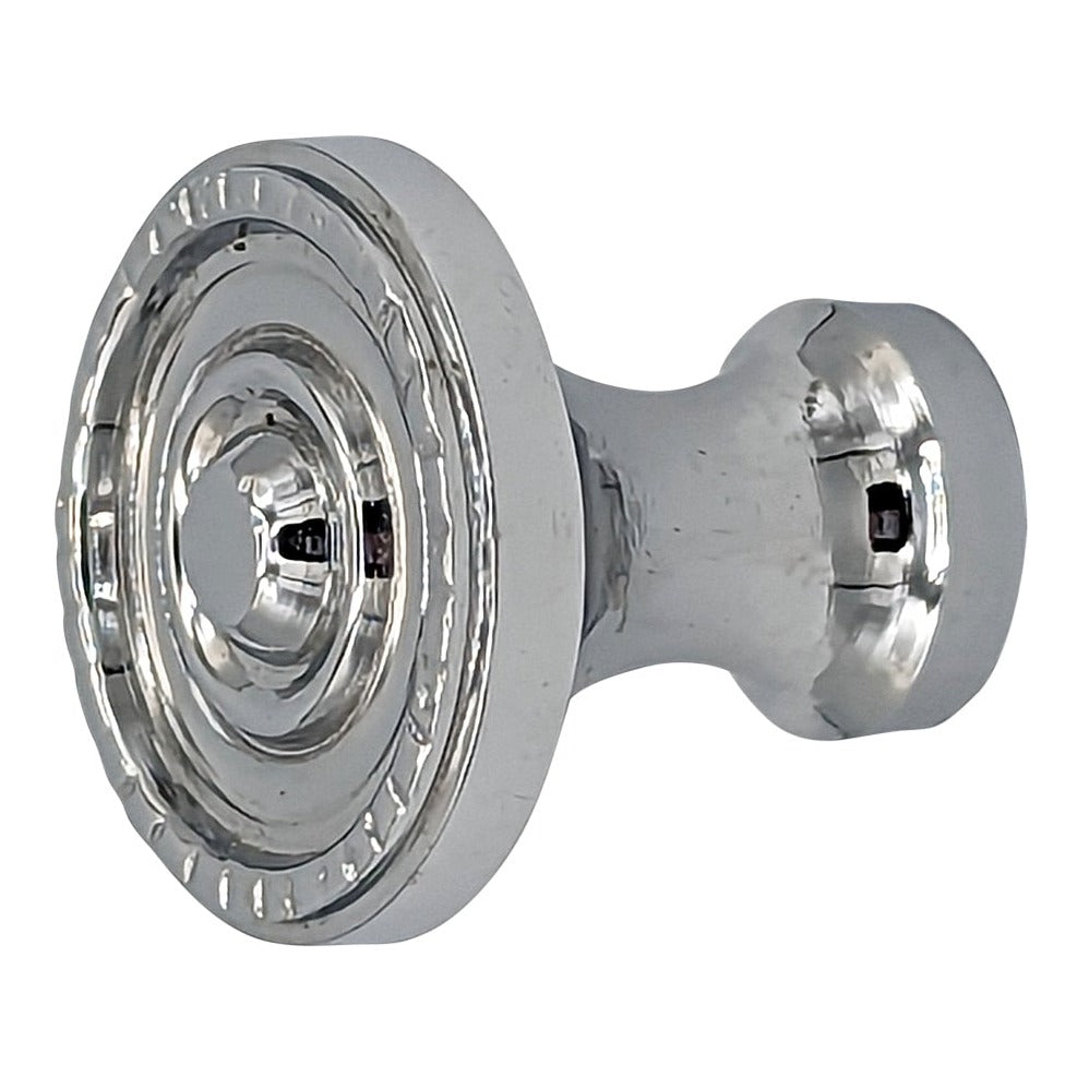 This cabinet knob measures 1 inch in diameter with a projection of 1 inch. It comes complete with mounting hardware and is part of a collection of coordinating hardware.