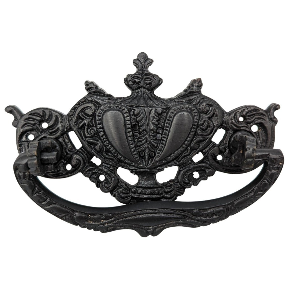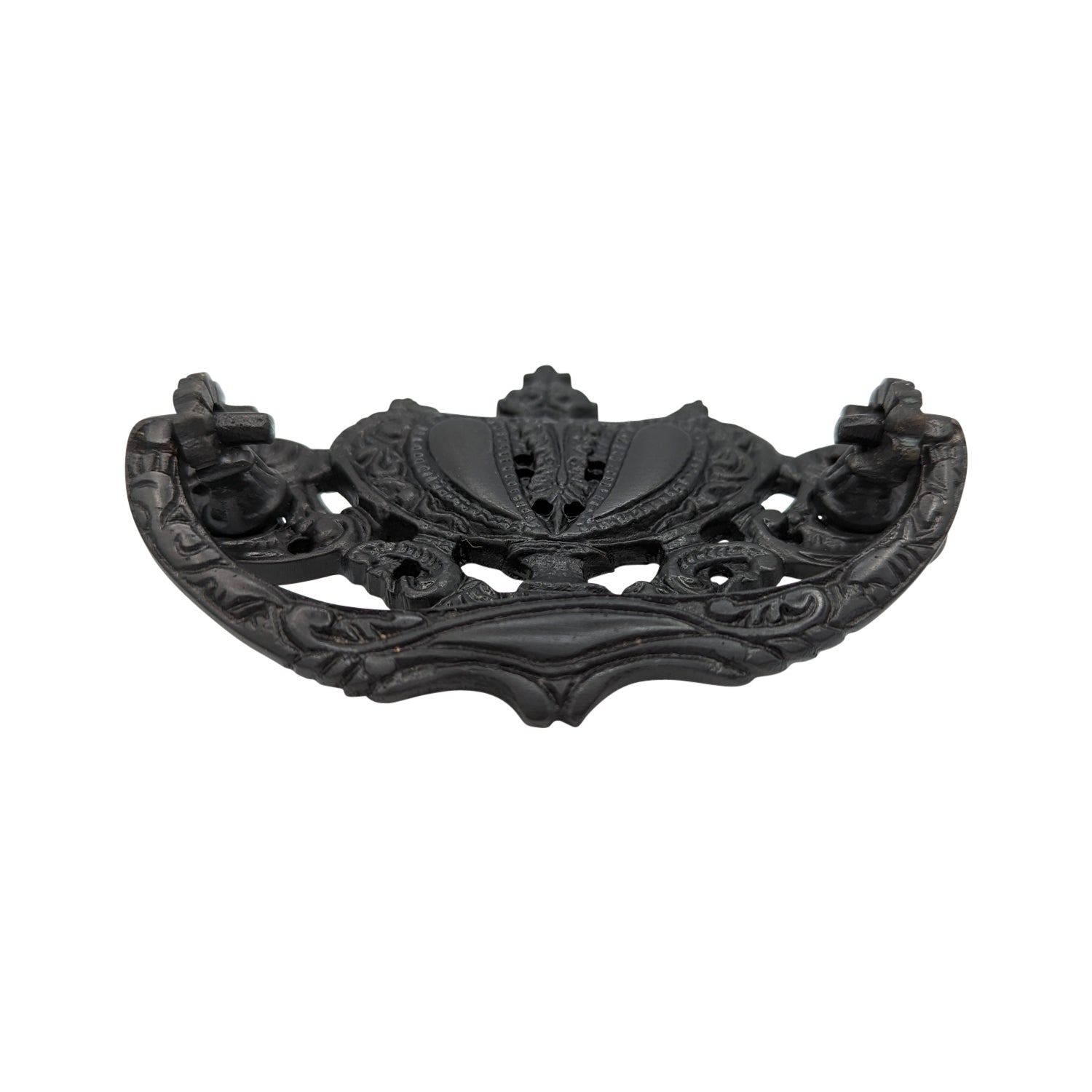 This bail pull measures approximately 4 1/4 inches long and by 2 1/2 inches tall with a 3 inch center to center measurement. This ornate bail pull is solid brass and comes with mounting hardware.