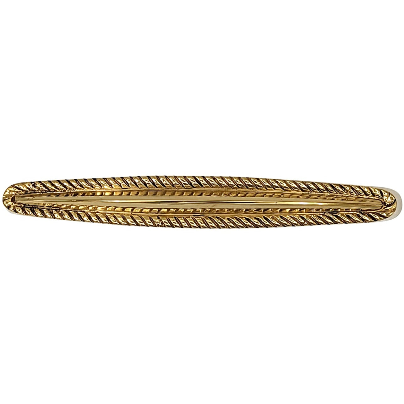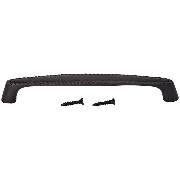 This pull measures 5 1/2 inch long and 5 inch center to center mounting distance (5.00 c-c) with a projection of 2/3 inch. Coordinating knob available. Comes complete with the mounting hardware. Comes in a variety of finishes including Polished Brass, Antique Brass, and Black Bronze.