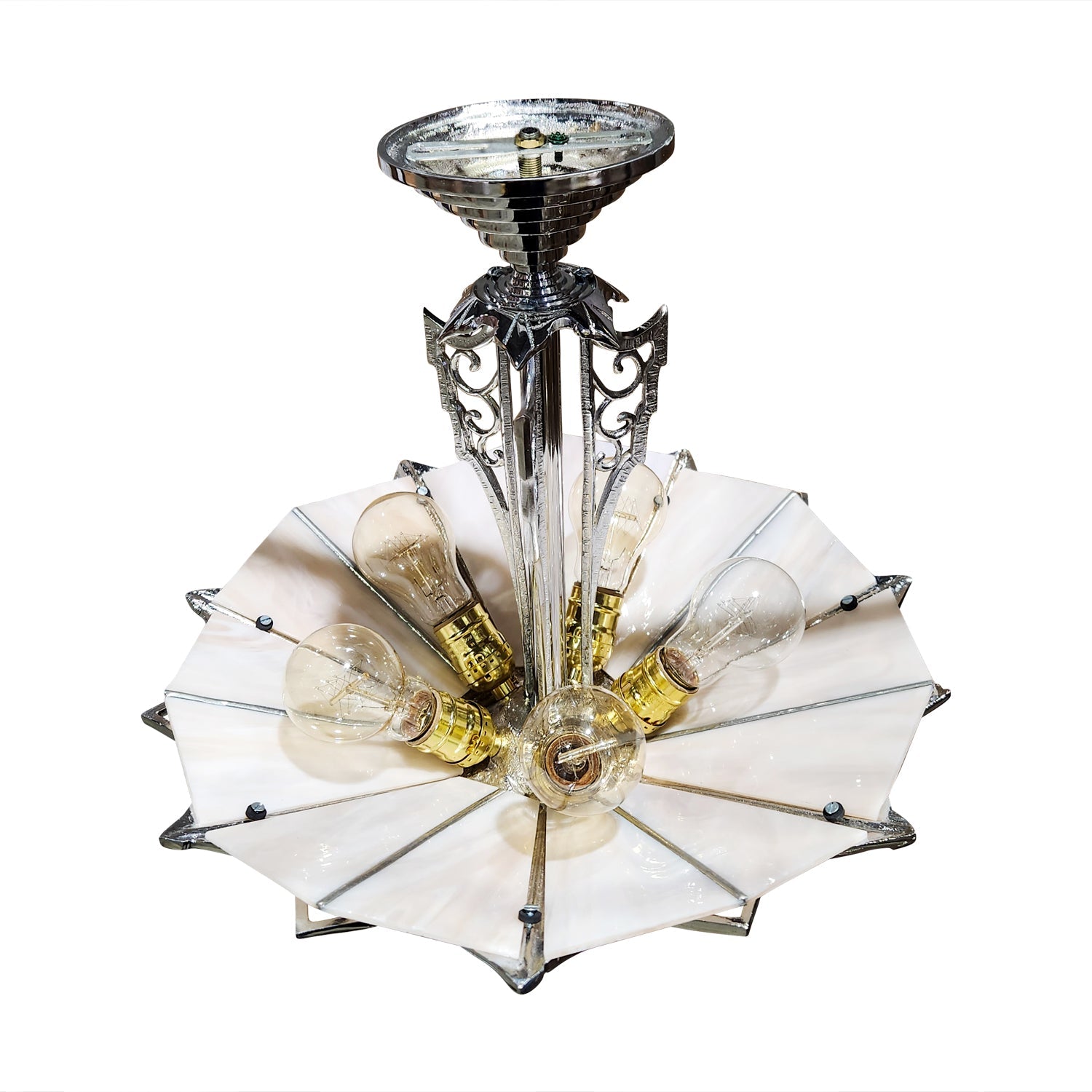 This item is hand crafted from solid brass using the Lost Wax casting method and this comes with stained glass panels that are made in Michigan. The chandelier's overall height measures approximately 17 inches with a 16 1/2 inch diameter. This close ceiling light is made from solid brass construction and weighs approximately 12.5 pounds. This uses five bulbs (maximum of 50 Watts each) and this fixture comes complete with the mounting hardware.