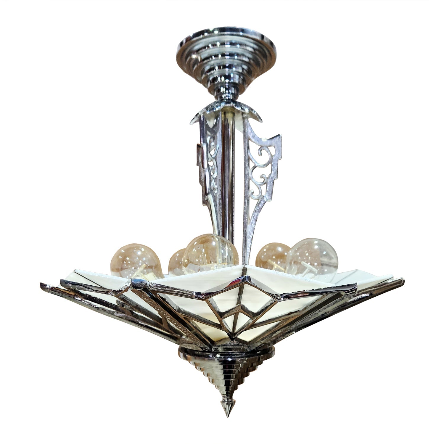 Illuminate your space with timeless elegance using the 17-inch Classic Art Deco Close Ceiling Light in a polished chrome finish. The exquisite white stained glass casts a soft and inviting glow, while the sleek lines and Art Deco design add a touch of sophistication to any room. Elevate your interior with this meticulously crafted ceiling light, where form and function harmonize to create a statement piece that transcends trends.