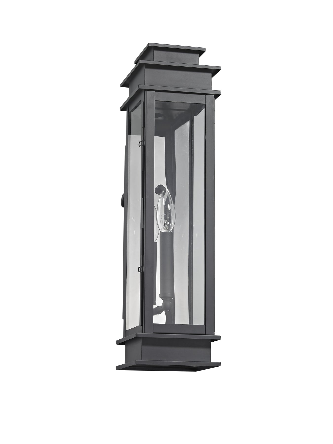 The 20207-04 Princeton Wall Lantern is a stunning blend of traditional design and modern durability. Handcrafted from solid brass, this outdoor fixture boasts a timeless black finish complemented by clear glass, creating an inviting ambiance. It measures 5.25 inches in width and 20.25 inches in height, extending 6 inches from the wall. The sconce requires one candelabra base bulb (not included) with a maximum wattage of 60W. Built to withstand the elements, it is suitable for both damp and wet locations, making it an ideal choice for outdoor spaces.