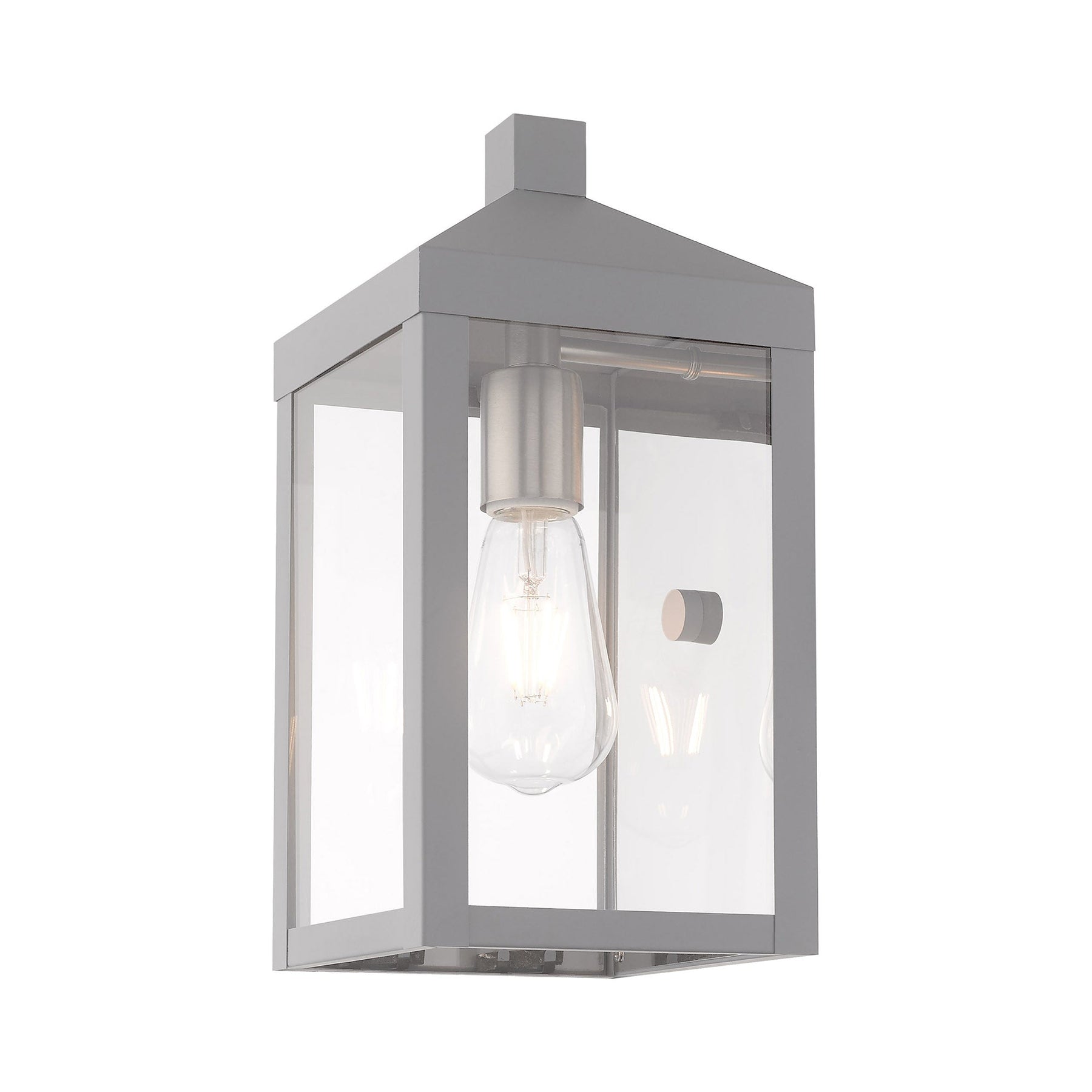 The Nyack Outdoor Wall Lantern, item number 20582-80, boasts a dramatically simple shape with bold lines, making it a perfect addition for those who appreciate a transitional style. Finished in a Nordic gray with clear glass panels, this fixture is hand-crafted from solid brass and enhances any outdoor space. Measuring 6.25 inches in width and 12.75 inches in height, it features a 6.25-inch extension and requires one medium base bulb with a maximum wattage of 100W (not included). Designed for both damp and wet locations, it is ideal for outdoor environments.