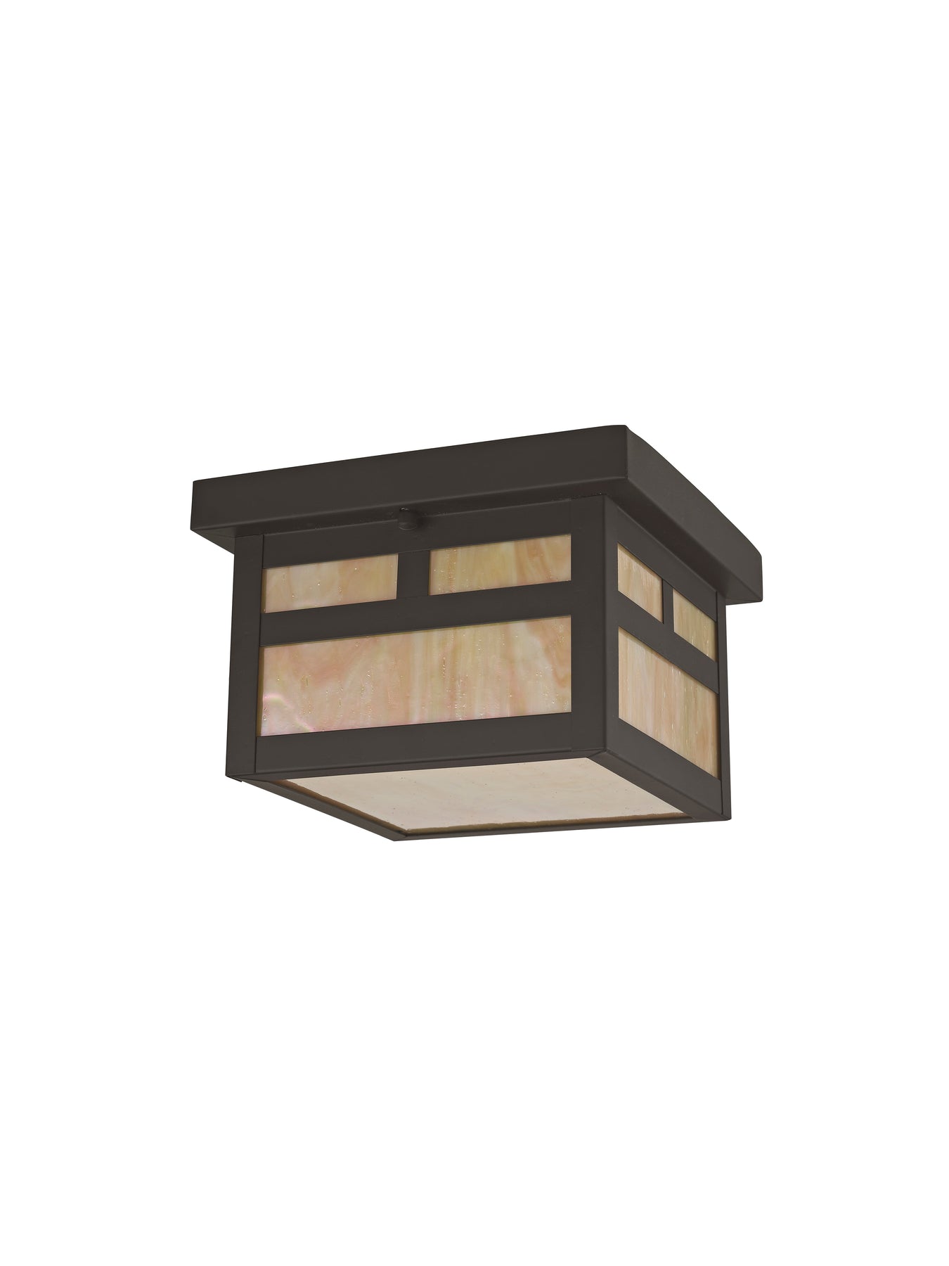 The 2138-07 Montclair Mission outdoor ceiling mount lantern is a stunning addition to any outdoor space, combining traditional design with modern durability. This luminaire features a beautiful iridescent Tiffany glass shade and is crafted from solid brass with a rich bronze finish. Measuring 8 inches in length, 8 inches in width, and 5.5 inches in height, it accommodates one medium base bulb with a maximum wattage of 60. The lantern is suitable for damp locations, making it perfect for outdoor areas exposed to moisture, while its architectural T-bar overlay adds a striking detail to its classic mission style.