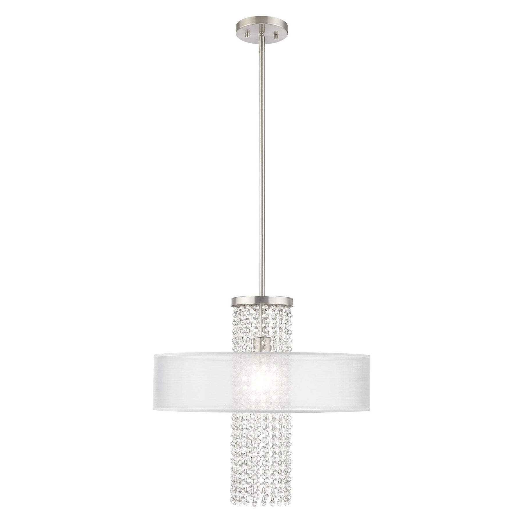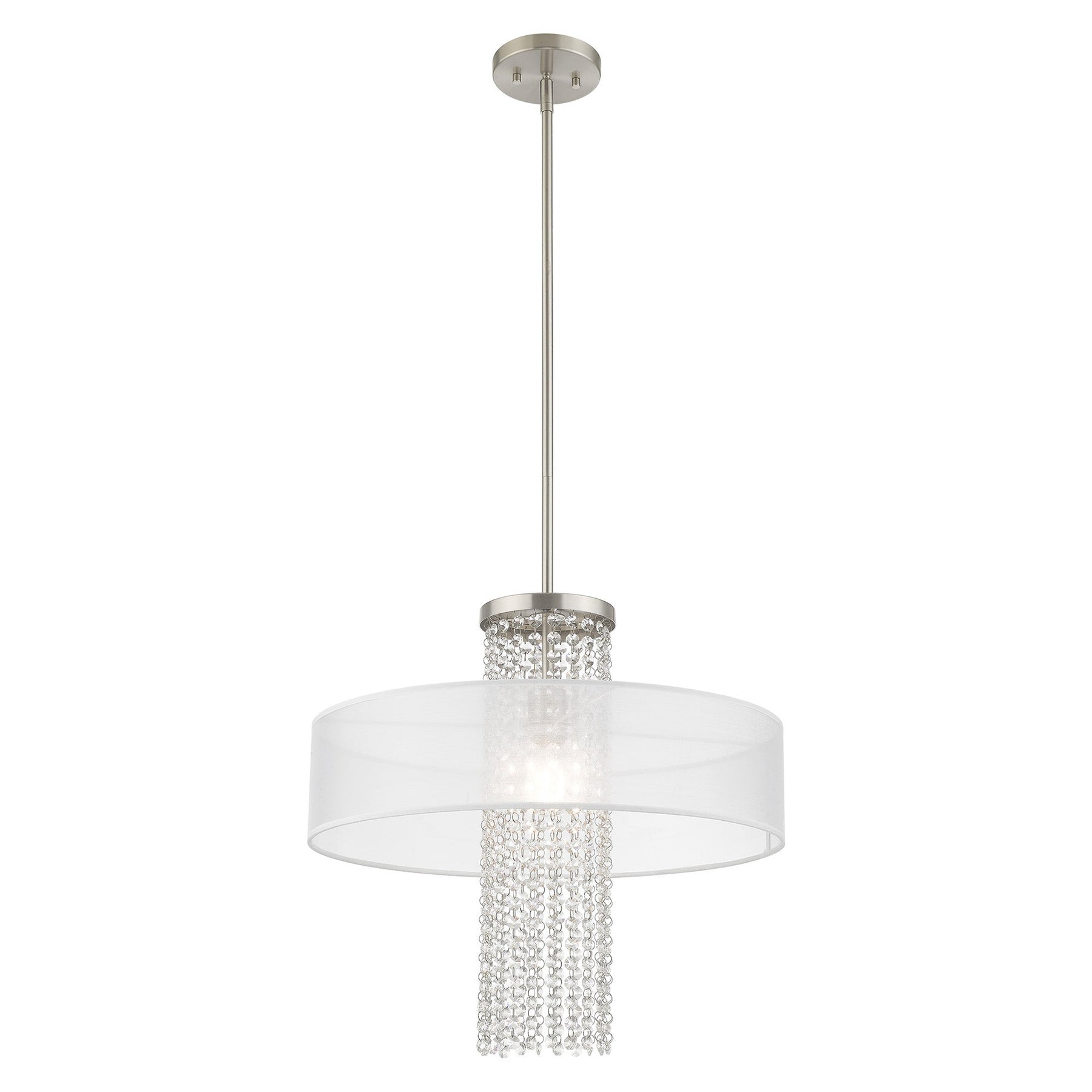 The Bella Vista Pendant Chandelier, item number 41121-91, is a stunning blend of elegance and modernity. This exquisite fixture features a handcrafted translucent fabric shade complemented by a brushed nickel finish and cascading clear crystal strands that create a dazzling waterfall effect. With adjustable height ranging from 27.5 inches to 57.5 inches and a diameter of 20 inches, it is designed to accommodate sloped ceilings. It utilizes one medium base bulb with a maximum wattage of 100W (bulb not included) and comes with 8 feet of wire along with interchangeable stem sections of 6, 12, and 18 inches for customization. This chandelier is suitable for damp locations, making it a versatile choice for various settings.