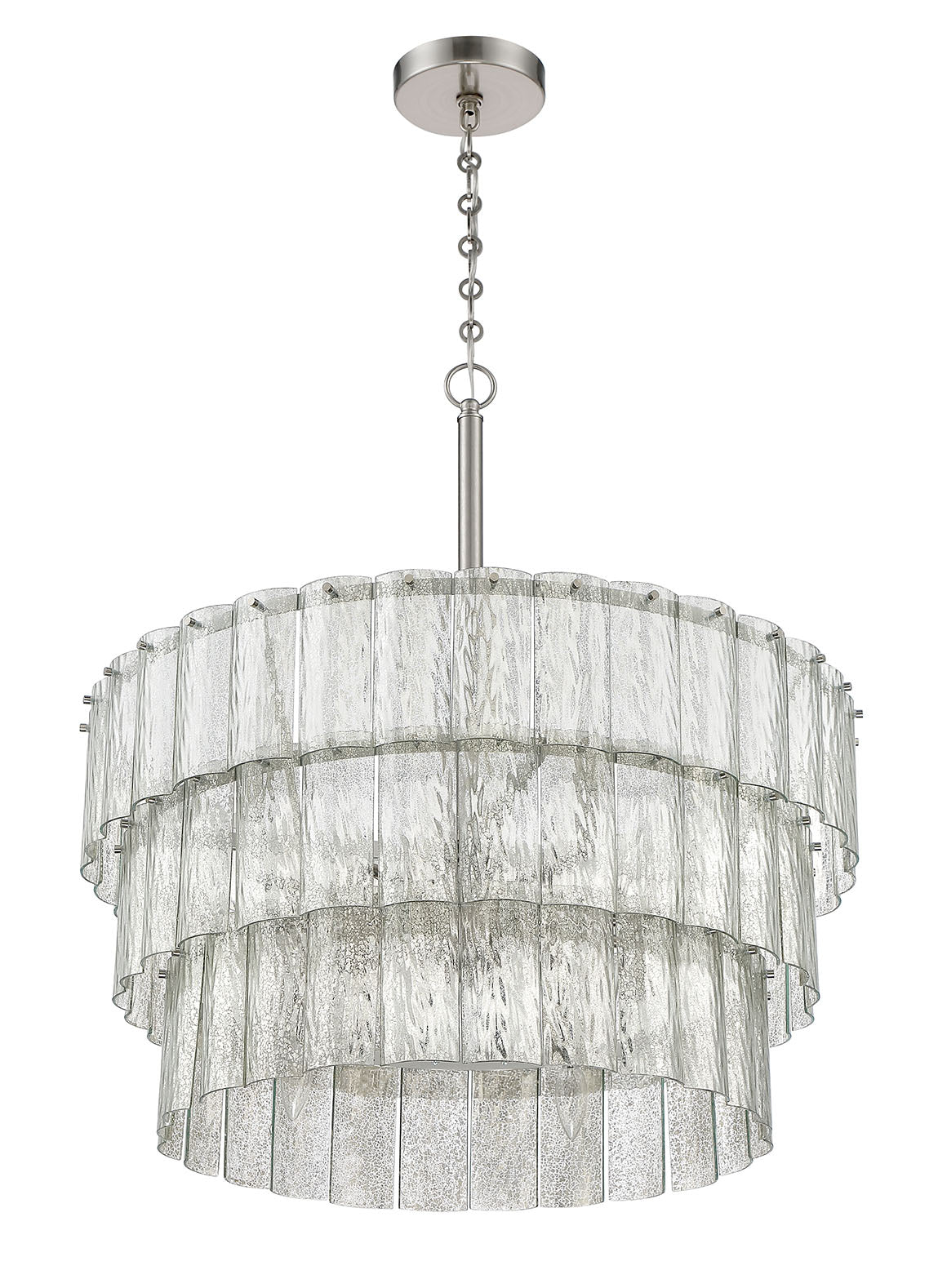 The Museo 12 Light Pendant in Brushed Polished Nickel is a stunning addition to any indoor space, combining elegance and functionality. This pendant features a sophisticated design with an antiqued mercury glass finish, adding a touch of luxury to your decor. Measuring 29.49 inches in width and depth and standing 32 inches tall, it is perfect for larger rooms. It requires 12 candelabra base E12 bulbs (not included), each with a maximum wattage of 40W, to illuminate your space beautifully. The pendant is chain hung, comes with a 6FT chain, and includes a 1-year limited warranty, ensuring both style and reliability.