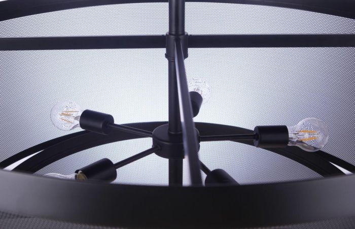The Mesh 9 Light Pendant in Flat Black is a stunning lighting fixture that adds sculptural elegance to any space. This pendant features a 6FT chain and is damp rated, making it perfect for use in various locations. It requires nine medium base 40 watt bulbs (not included) to provide ample illumination. With a height of 45.25 inches, a canopy width of 5.50 inches, and a leadwire length of 108 inches, this pendant offers adjustable height capabilities. Its clean drum silhouette and minimalist aesthetic enhance any decor while the sturdy design ensures lasting quality.
