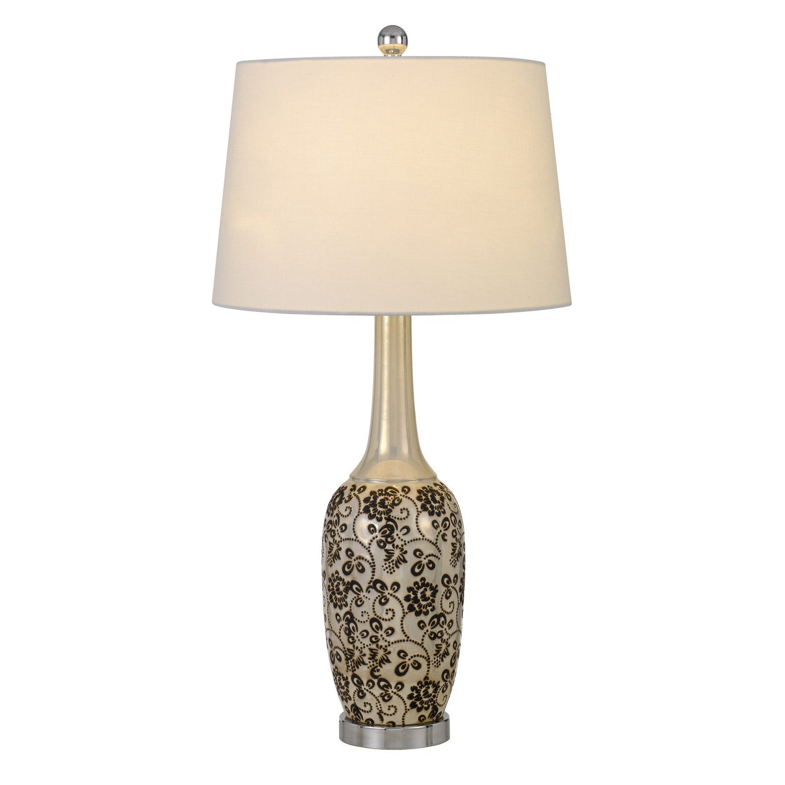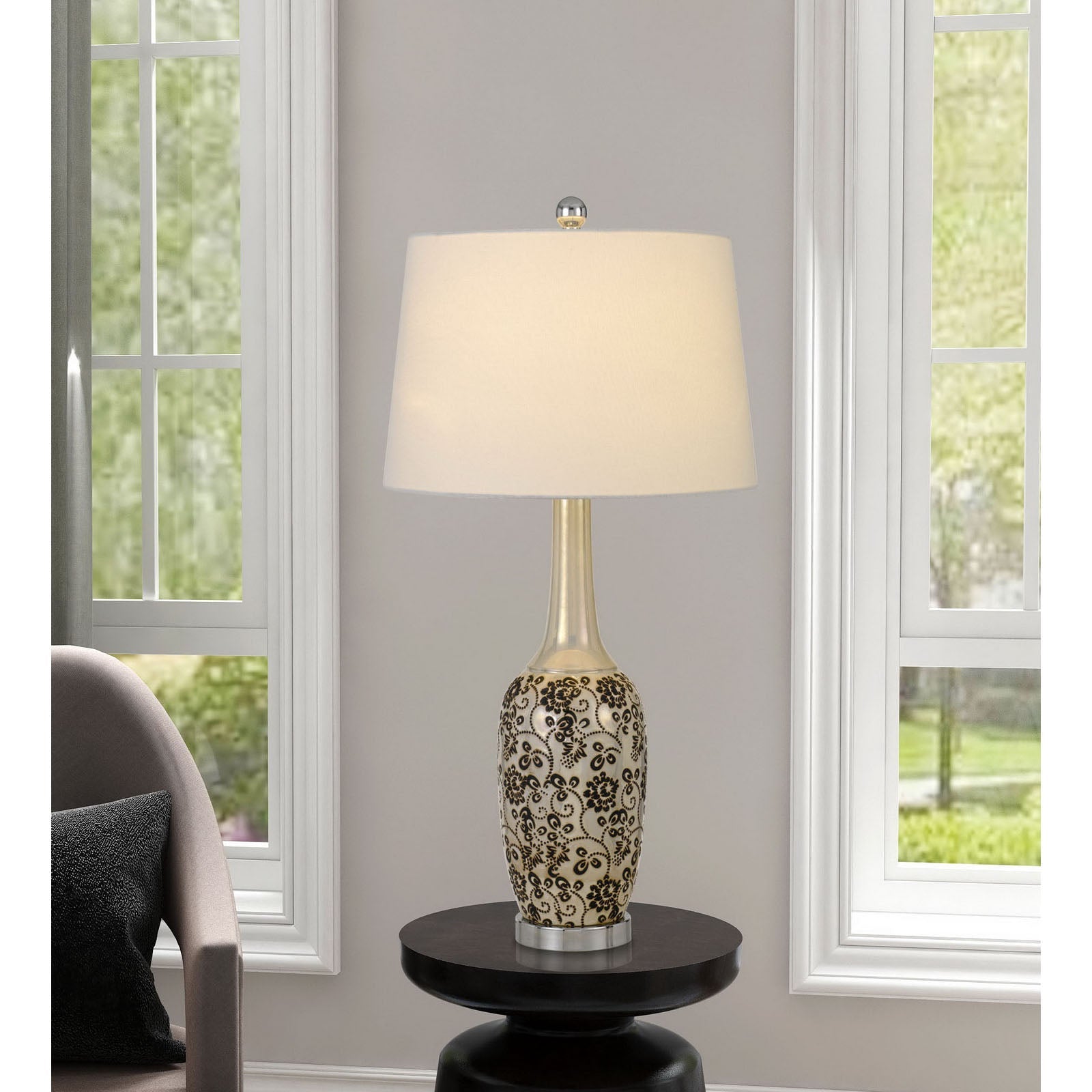 The BO-2914TB-2 Paxton Ceramic Table Lamp features a stunning leaf design and is paired with a taper drum hardback fabric shade, making it an ideal addition to your decor. This elegant lamp boasts a ceramic bottle shape and a durable metal base. Designed to illuminate your space, it operates with two E26 bulbs (not included) with a maximum wattage of 150W. The lamp stands at a height of 25 inches and a width of 16 inches, providing ample lighting without overpowering the room. Assembly is required, but the elegant long neck style and iridescent pearl finish make it a show-stopping centerpiece in any setting. It typically ships in 3 business days and comes with a one-year warranty against defects in material and workmanship.