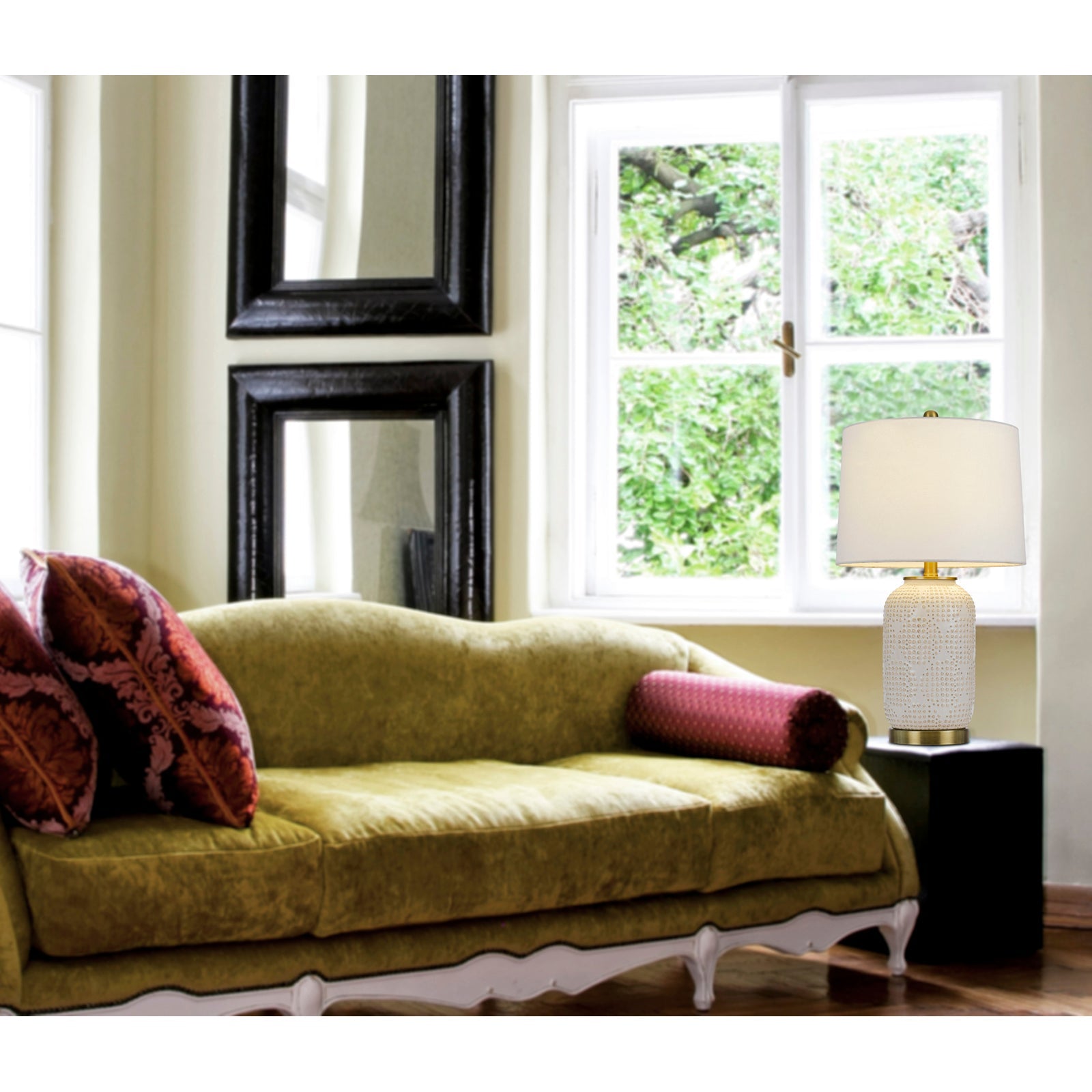 The BO-3022TB 150W 3-way Sedalia ceramic table lamp is a stunning addition to any home decor. Featuring a beautiful pearl white ceramic body with a dot design and a hardback fabric shade, this lamp adds a touch of elegance to your living space. Its unique mason jar design, coupled with an ivory finish, complements a variety of interior styles. The lamp is supported by a sturdy metal base and includes a matching finial. Designed for convenience, it accommodates one E26 bulb and offers a 3-way switch for adjustable lighting. Measuring 14.50 inches in length, 15.50 inches in width, and 18.50 inches in height, this lamp is both functional and stylish, making it a perfect choice for any room.