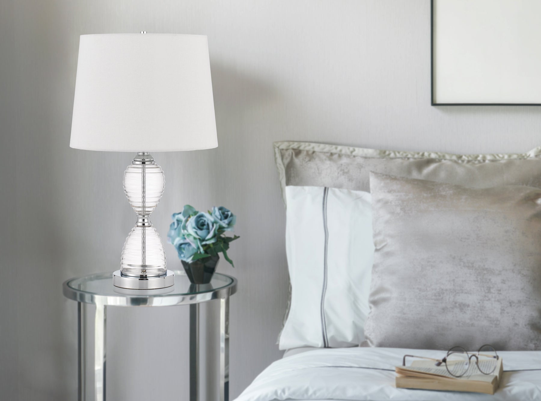The Eden Glass Table Lamp (Product No. BO-3027TB) is a sophisticated addition to any decor, featuring a durable glass construction and an elegant hourglass silhouette. This lamp comes with a stylish taper drum hardback fabric shade and utilizes a 150W bulb with a convenient 3-way switch for customizable lighting. Its weighted base ensures added stability, making it perfect for various settings. Measuring 15.50 inches in length and width with a height of 19.30 inches, this lamp is not just functional but also a statement piece that will illuminate your space beautifully.