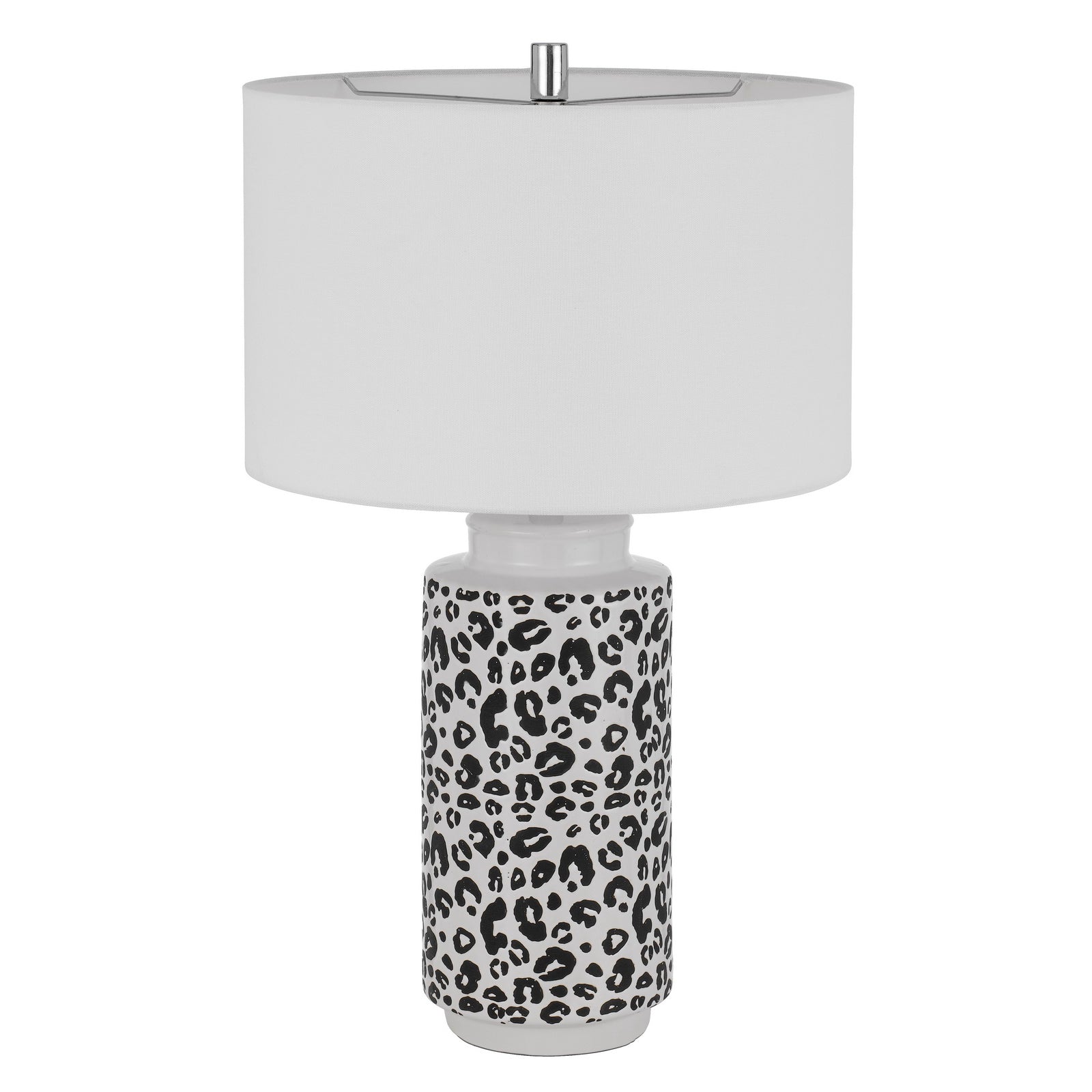 The Exeter Ceramic Table Lamp, product number BO-3045TB-2, features a striking painted cheetah pattern on a durable milky ivory ceramic base. With a hardback linen shade, this lamp is designed for both style and resilience. It operates with a 150W three-way switch, allowing for versatile lighting options. Sold as a pair, these lamps require minor assembly and ship conveniently in one carton. Perfect for updating your room's decor, they combine functionality with a bold and unique aesthetic.