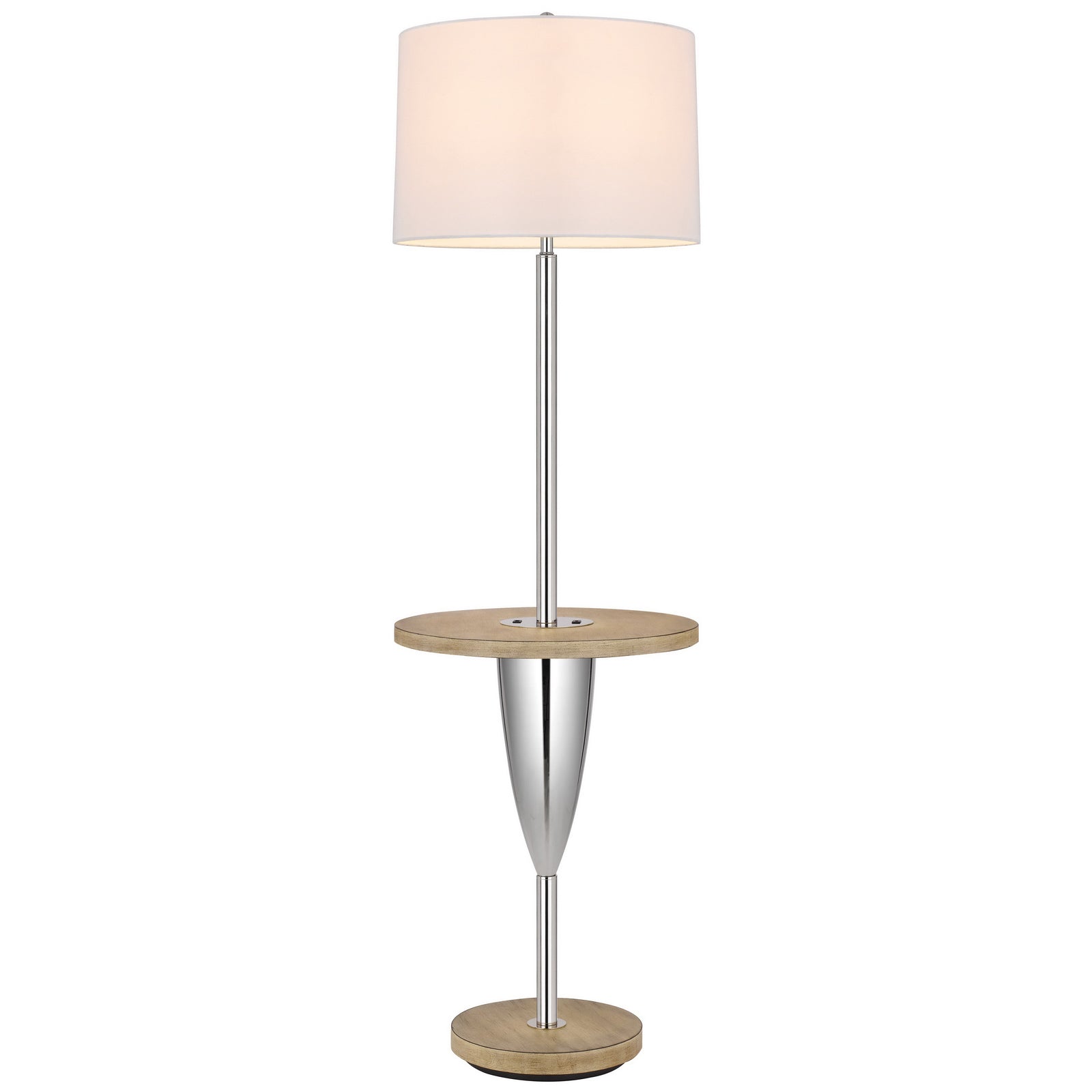 The BO-3054TFL 150W 3-Way Lockport Metal Floor Lamp is a perfect blend of style and functionality for any room. Featuring a durable metal construction with a high gloss chrome finish and elegant wooden accents, this lamp is designed to enhance your space. It comes equipped with a circular wooden tray table at the center, offering convenience alongside a functional USB port and a Type C USB charging port for your devices. With its weighted base for stability and a chic hardback fabric shade included, this lamp not only illuminates but also beautifies your area. It requires one E26 bulb (not included) and measures 20.30 inches in length, 20.30 inches in width, and 18.00 inches in height, ensuring it fits seamlessly into your decor.
