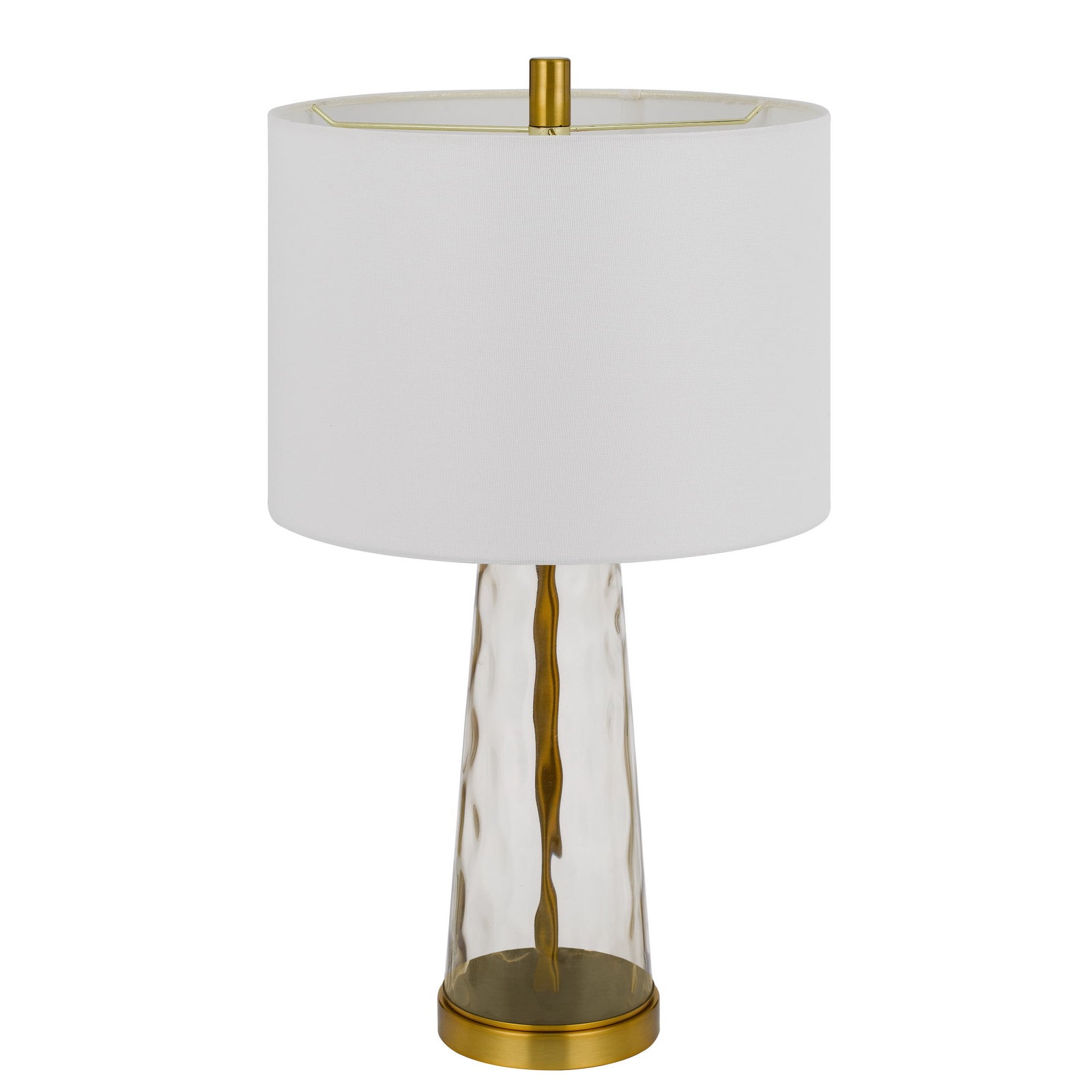 The BO-3059TB-2 100W Heber glass table lamp is a stunning addition to any room, sold as a pair for added value. This lamp boasts a durable metal and glass construction with a light smoke ripped glass body, exuding a touch of glam. Each lamp is topped with a hardback linen shade for a polished finish. With little to no assembly required and packaged in a single carton, it is designed for convenience. It operates with a standard E26 bulb base and features an ON/OFF switch, making it practical for daily use. Measuring 14 inches in length and width, and 26 inches in height, this elegant lamp set is perfect for enhancing your decor.