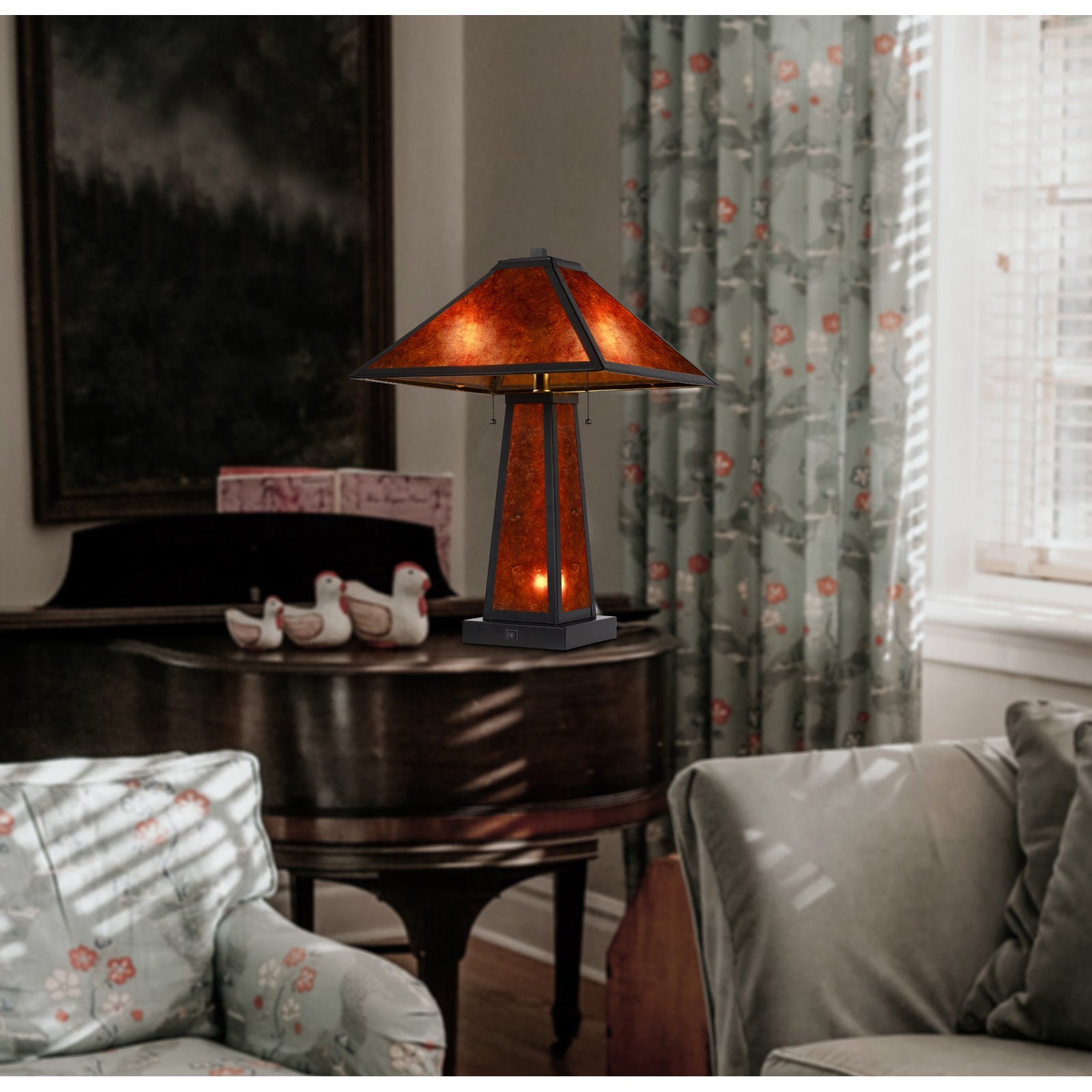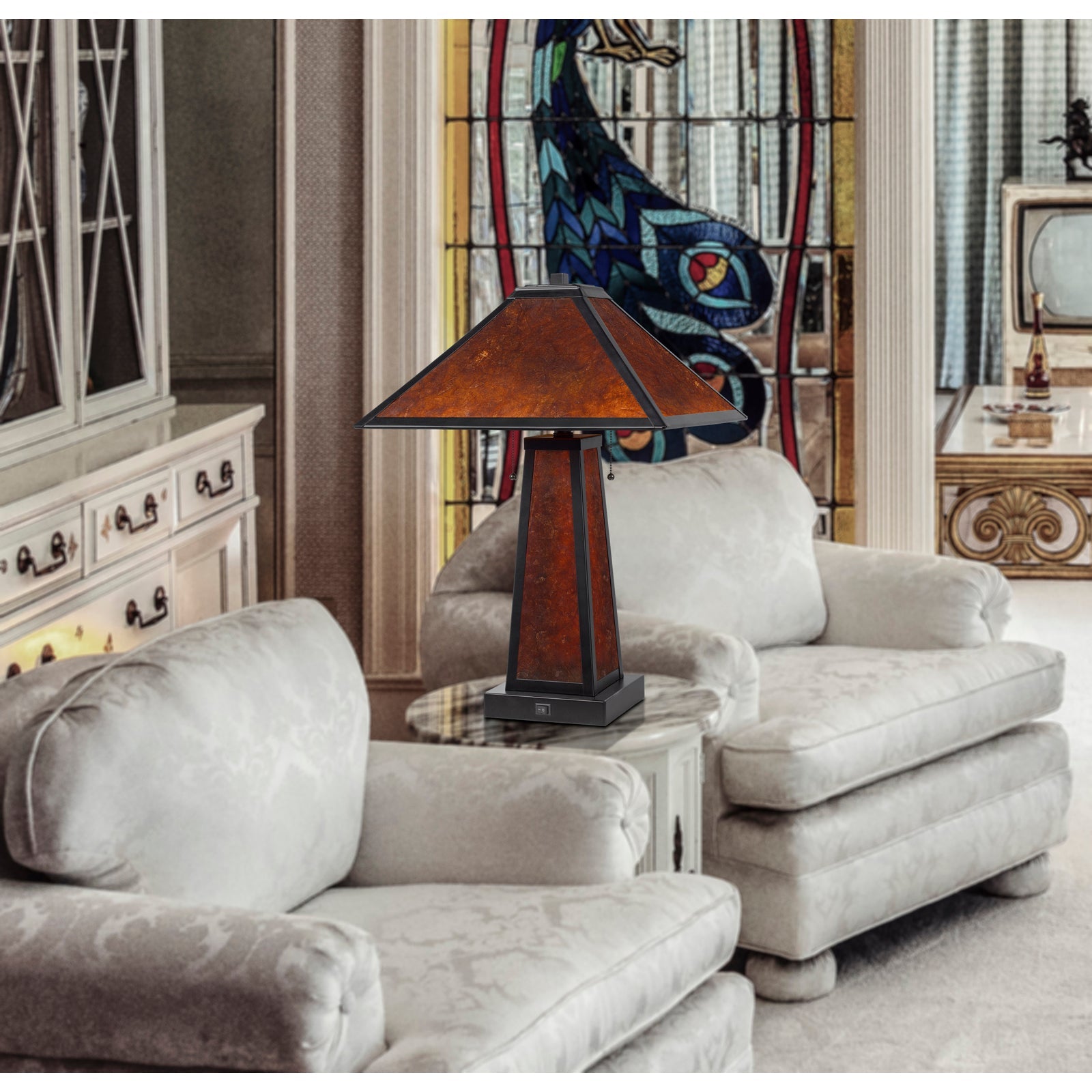 The BO-3070TB Nogales mission style mica table lamp is a beautiful addition to any space, providing a warm and inviting ambiance. It features a durable metal and compressed amber mica construction, ensuring longevity and aesthetic appeal. This lamp offers two 60W sockets and includes a 7W night light bulb, providing versatility in lighting options. The pull chain switch and on/off rocker switch on the base make it easy to operate. Measuring 21.30 inches in length, 10.30 inches in width, and 25.80 inches in height, this lamp requires little to no assembly and ships in one carton. Backed by a one-year warranty, it is designed to be free from defects in material and workmanship, portable, and perfect for enhancing your home's charm.