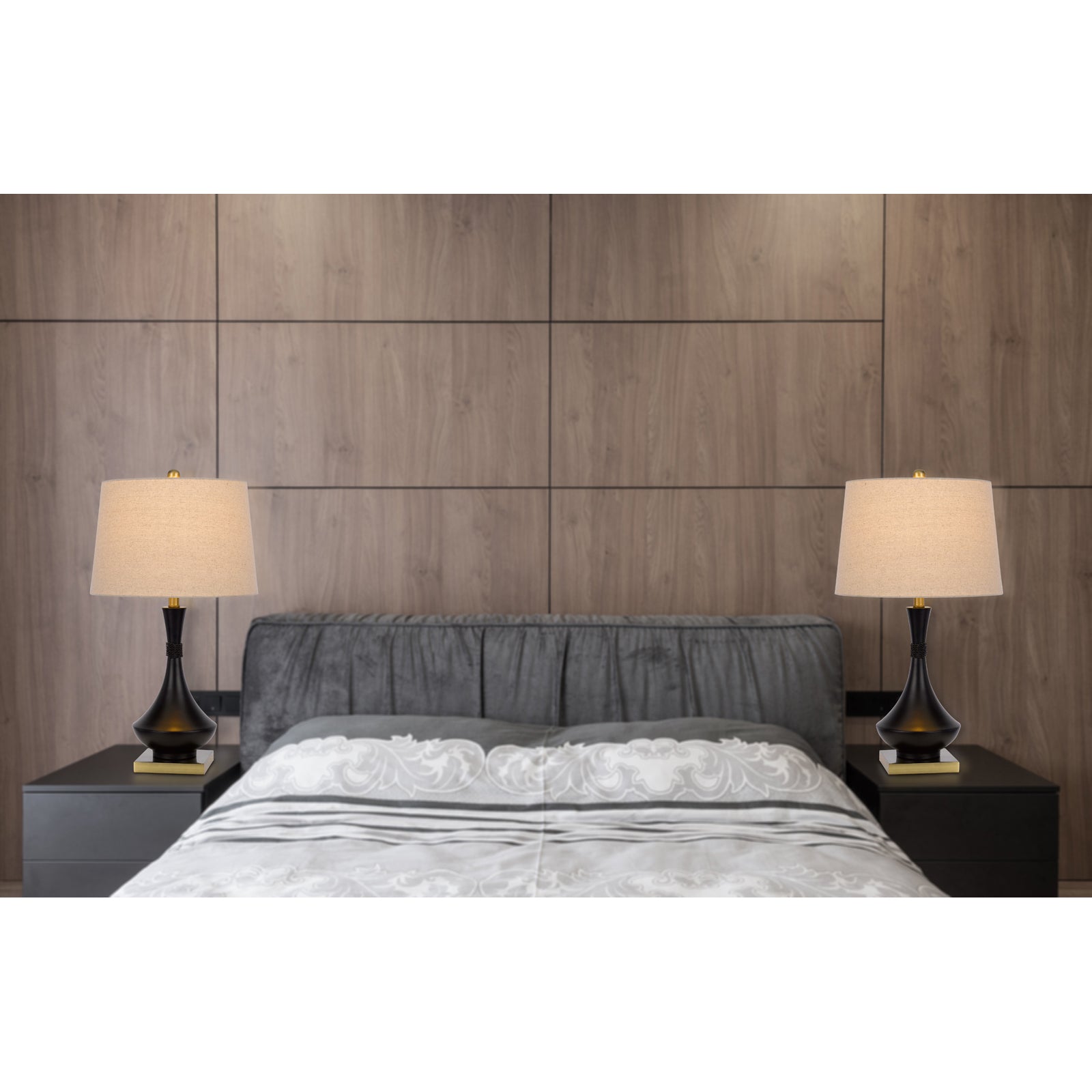The BO-3072TB-2 Hilo Metal Table Lamp set is a perfect blend of style and functionality, enhancing your decor with elegance. This pair of lamps features durable metal construction, stylish black finish, and hardback linen shades, making them a sophisticated addition to any room. Each lamp has a wattage of 100W and utilizes an E26 bulb base for optimal brightness. With a compact package dimension of 18.80 inches in length, 16.50 inches in width, and 23.50 inches in height, they ship conveniently in one carton and require little to no assembly. Backed by a one-year warranty, this set is designed to provide both aesthetic appeal and reliable performance.