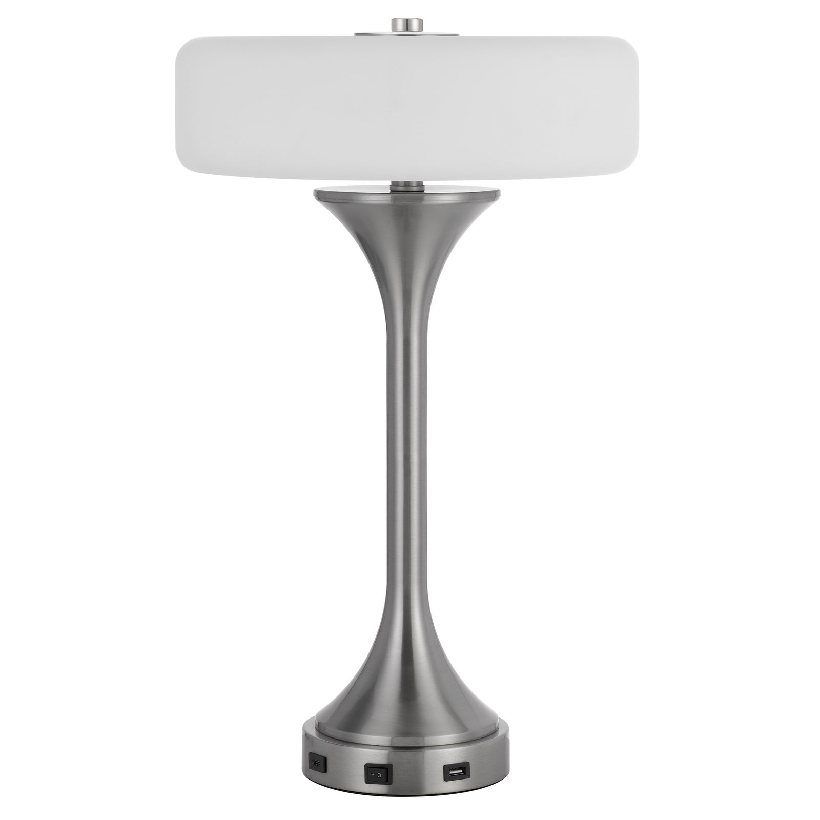 The Espoo Metal Desk/Table Lamp (Product No. BO-3137TB) combines modern design with functionality, making it an ideal addition to any bedside or coffee table. This lamp features a durable metal construction in brushed steel and includes three 25W E12 bulbs (not included) for ample lighting. It boasts a stylish frosted glass shade that diffuses light beautifully. Additional features include a convenient rocker switch on the base, a weighted base for stability, and two USB ports for easy charging. Measuring 24.30 inches in length, 16.00 inches in width, and 12.00 inches in height as packaged, this lamp is perfect for contemporary spaces.