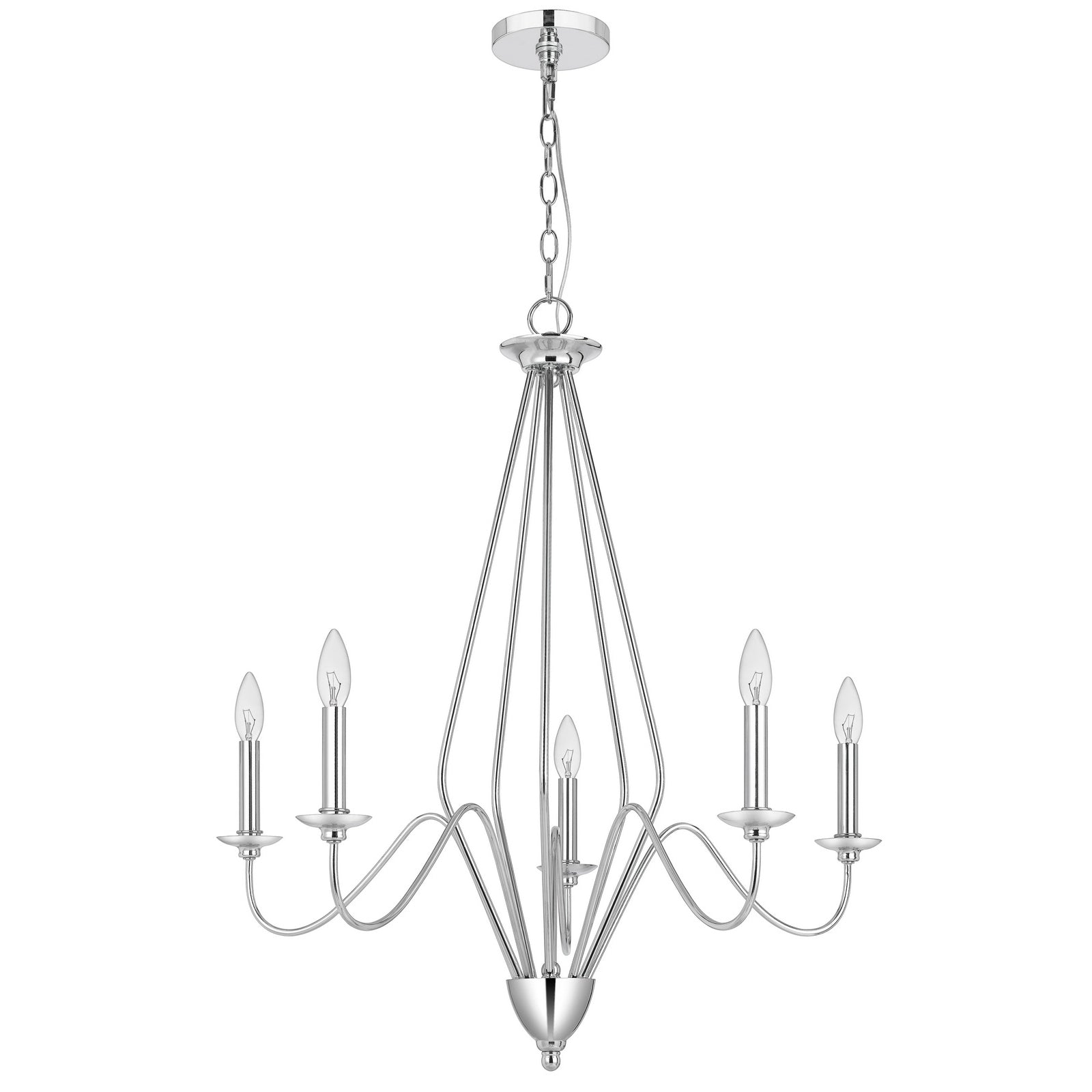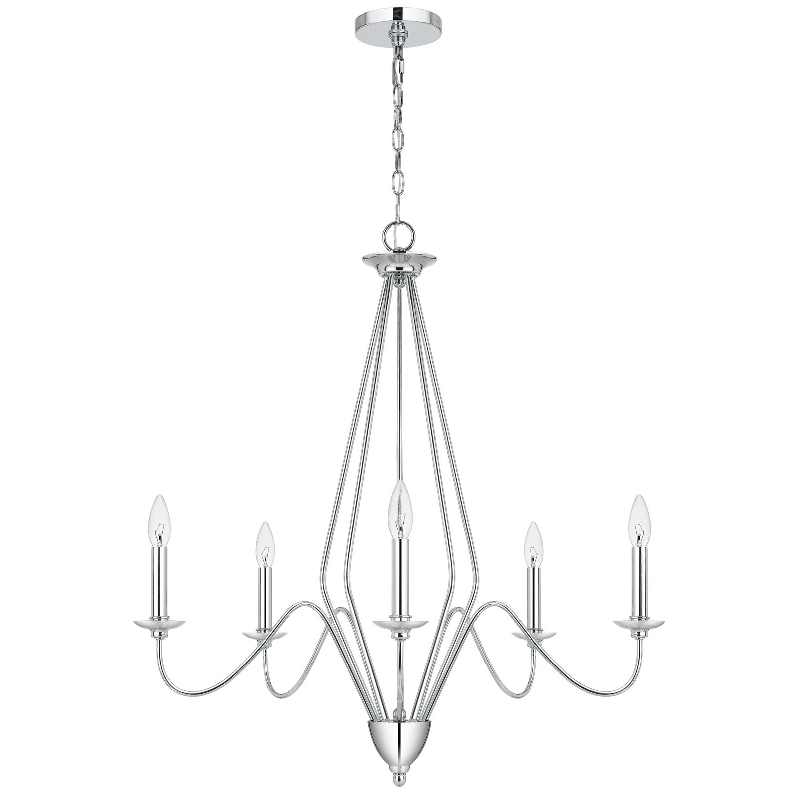 The Norwich Metal Chandelier, Product No. FX-3774-5, is a striking addition to any contemporary space, featuring a durable metal construction with a sleek chrome finish. This chandelier includes a canopy and comes with six feet of chain for adjustable hanging. It accommodates five E12 candelabra base bulbs with a maximum wattage of 60W each, ensuring ample illumination. With minor assembly required, this stylish fixture ships in one carton and is hardwired for safety. Backed by a one-year warranty, it is a perfect blend of functionality and modern elegance.
