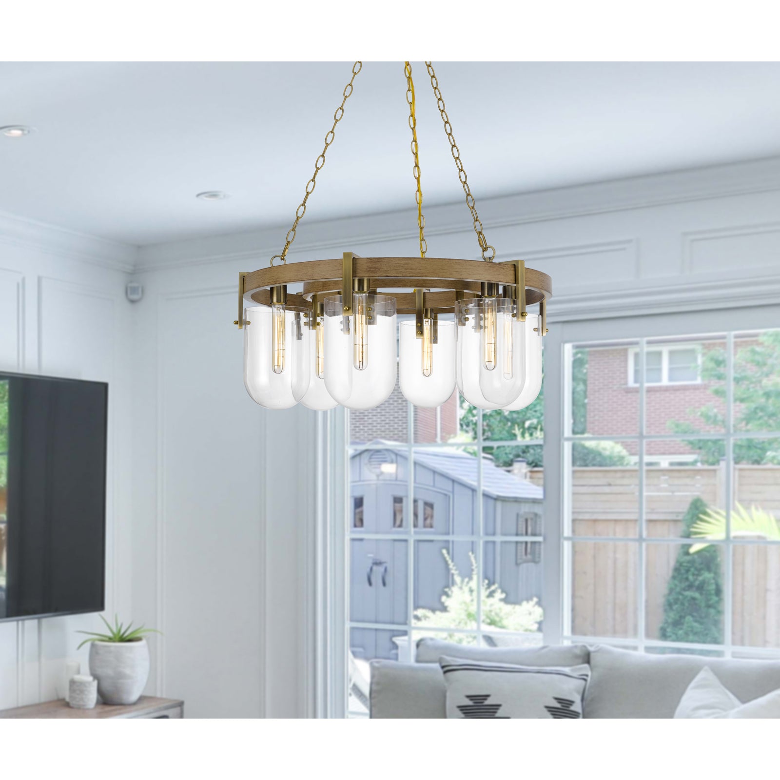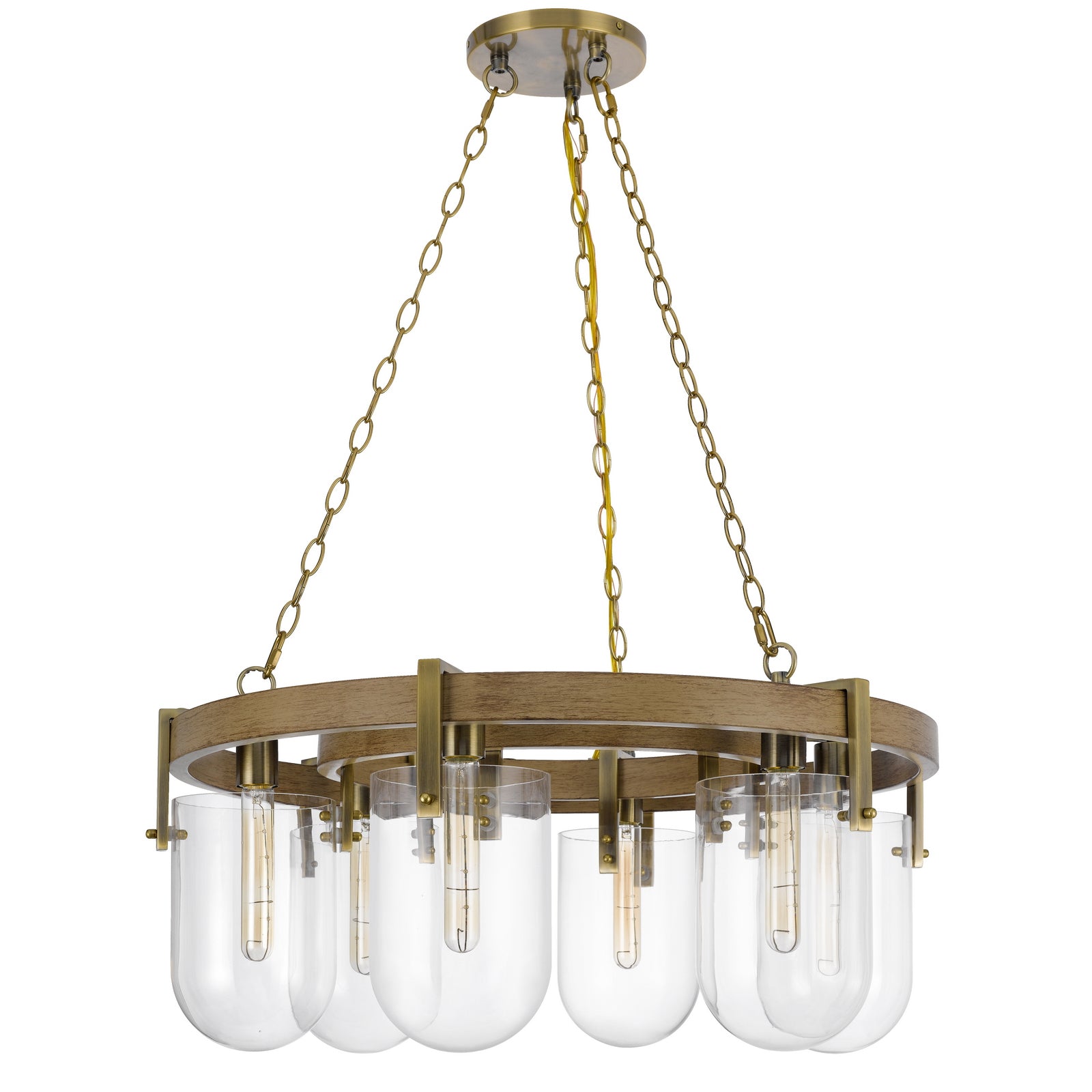 The Stovall 60W x 6 Metal/Glass Chandelier is a stunning wagon wheel style fixture perfect for adding a distinctive touch to any space. This hardwired chandelier features a durable construction combining metal and wood, along with elegant bullet style glass shades that diffuse light beautifully. It supports six E26 base bulbs (not included) with a maximum wattage of 60W each. The chandelier comes with a 72-inch antique brass chain and ships in one carton, ensuring a seamless installation process. With minor assembly required and a one-year warranty against defects, this chandelier effortlessly combines style and functionality.