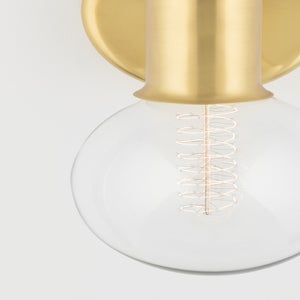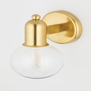 The Bryce Wall Sconce by Mitzi is a sleek and elegant lighting fixture that adds a touch of sophistication to any space. Standing 9.00 inches tall with a width of 5.00 inches and a 6.00-inch extension, this sconce is designed to accommodate one E26 medium base bulb (not included), with a maximum wattage of 60W. It features stunning finish options in Aged Brass (AGB) or Polished Nickel (PN) that can enhance your decor. With a UL Damp rating, the Bryce is ideal for installation in areas prone to moisture, such as bathrooms, making it both functional and stylish.