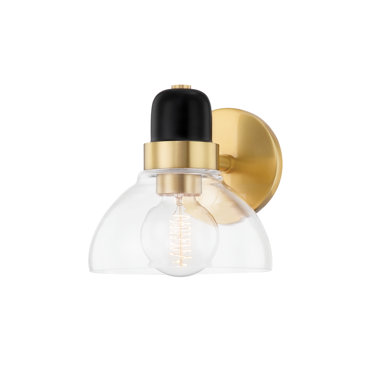 The Camile Wall Sconce by Mitzi in Aged Brass offers a sophisticated and elegant lighting option for any space. This stylish fixture features a clear glass shade and requires one E26 medium base bulb, with a maximum wattage of 60W (bulb not included). With dimensions of 7.50 inches in width, 8.00 inches in height, and an extension of 8.50 inches, it is versatile enough for various settings. Additionally, its UL Damp rating makes it suitable for use in bathrooms and other humid environments.