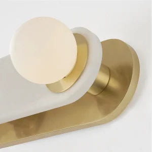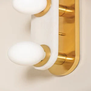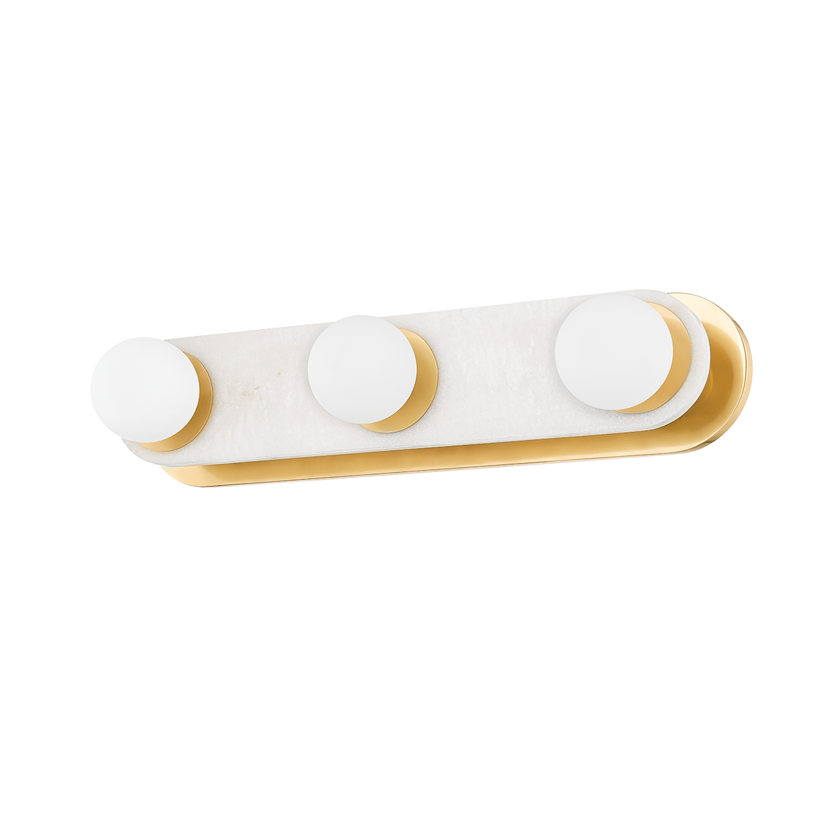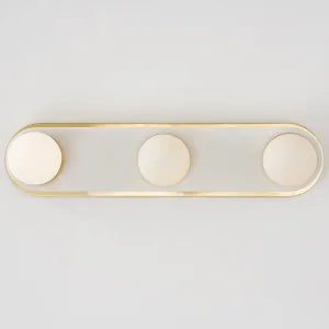 Glass globes are backed in Aged Brass then displayed on a piece of Soft Thassos white marble and mounted to a similarly shaped piece of Aged Brass creating a gorgeous layering effect. The marble has very little veining or variation, and the streamlined racetrack silhouette gives the design a jewelry-like quality. The three-light sconce can be mounted horizontally or vertically making it ideal for the bath or powder room.