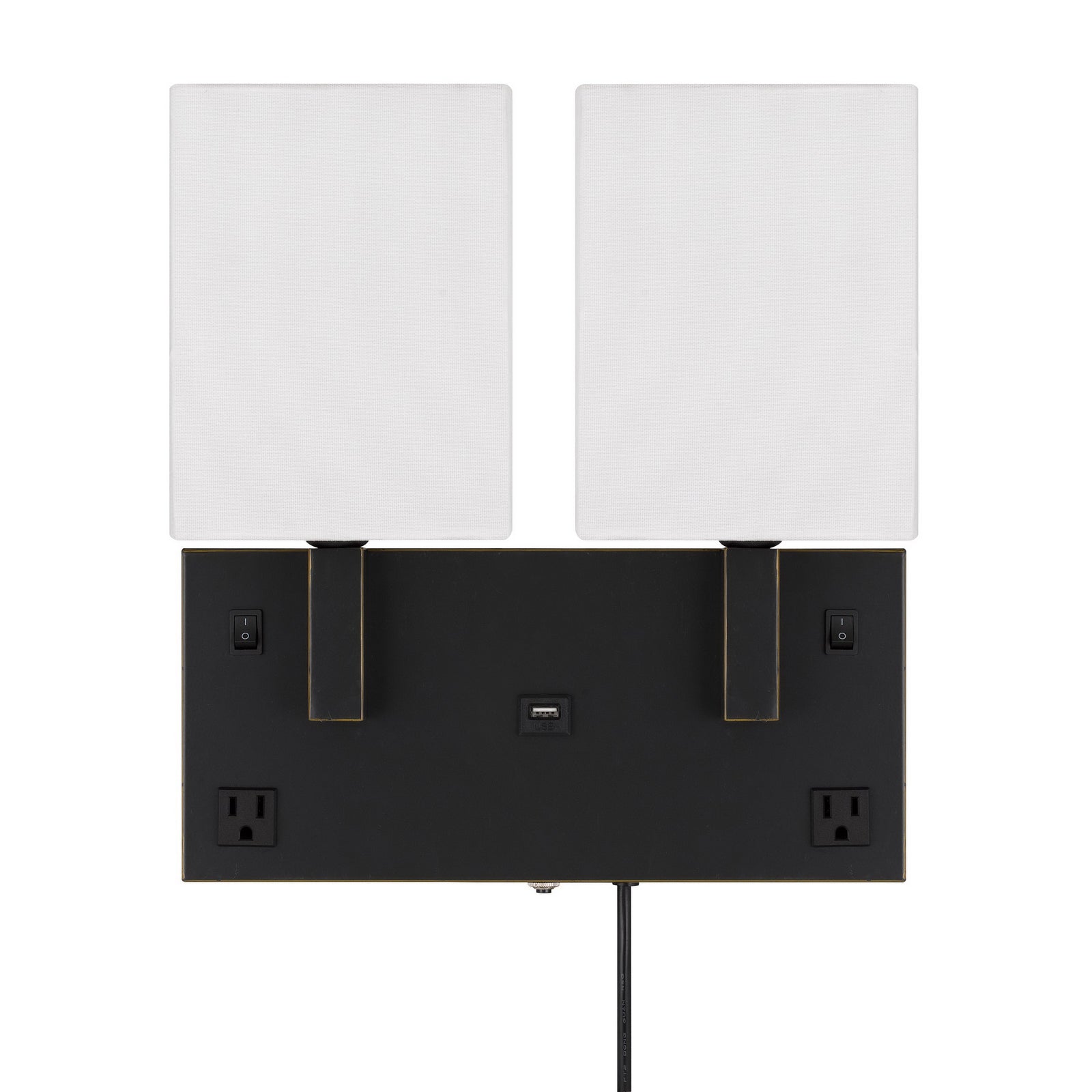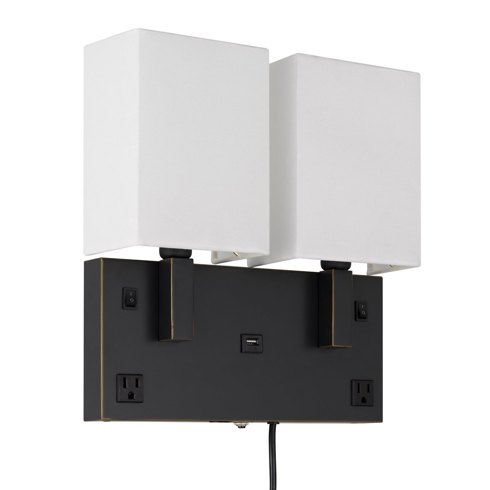The LA-8048W2L-1 Oberlin Wall Lamp is a modern and functional addition to any space, featuring a durable metal construction and a stylish hardback fabric shade panel. This lamp utilizes two 40W bulbs (E12 base, not included) and includes two power outlets and one USB charging port on the base for added convenience. It measures compactly for versatile placement and is equipped with a rocker switch for easy operation. Assembly is required, and it comes with a one-year warranty, ensuring quality and reliability.