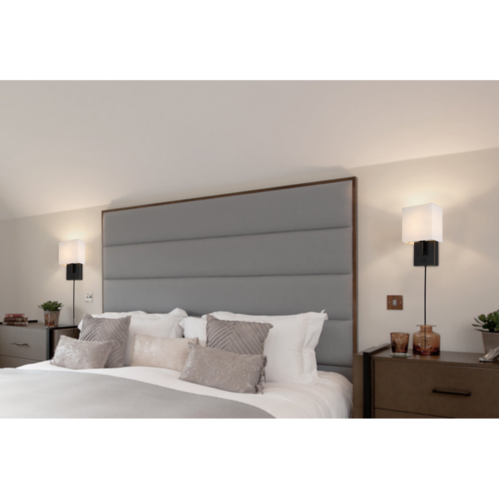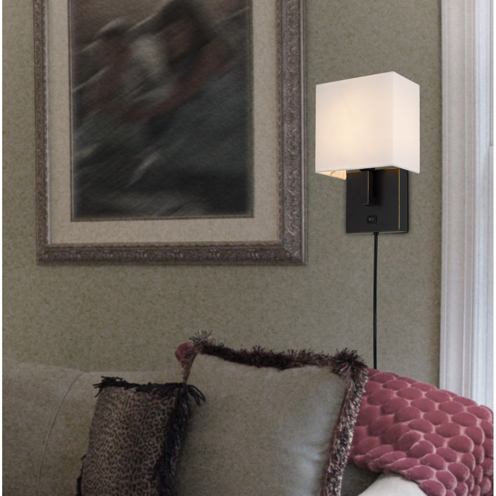 The 40W Oberlin Wall Lamp, model LA-8048WL-1, combines modern aesthetics with practical functionality. Crafted from durable metal, this single light construction features a hardback fabric shade panel, providing a soft, warm glow. It is equipped with a USB port and a functional outlet on the base for convenient charging of electronic devices, while a rocker switch allows for easy operation. Measuring 18.80 inches in length and 14.80 inches in width, this lamp is designed for versatility and requires assembly. It is compatible with an E12 bulb base and carries a one-year warranty against defects.