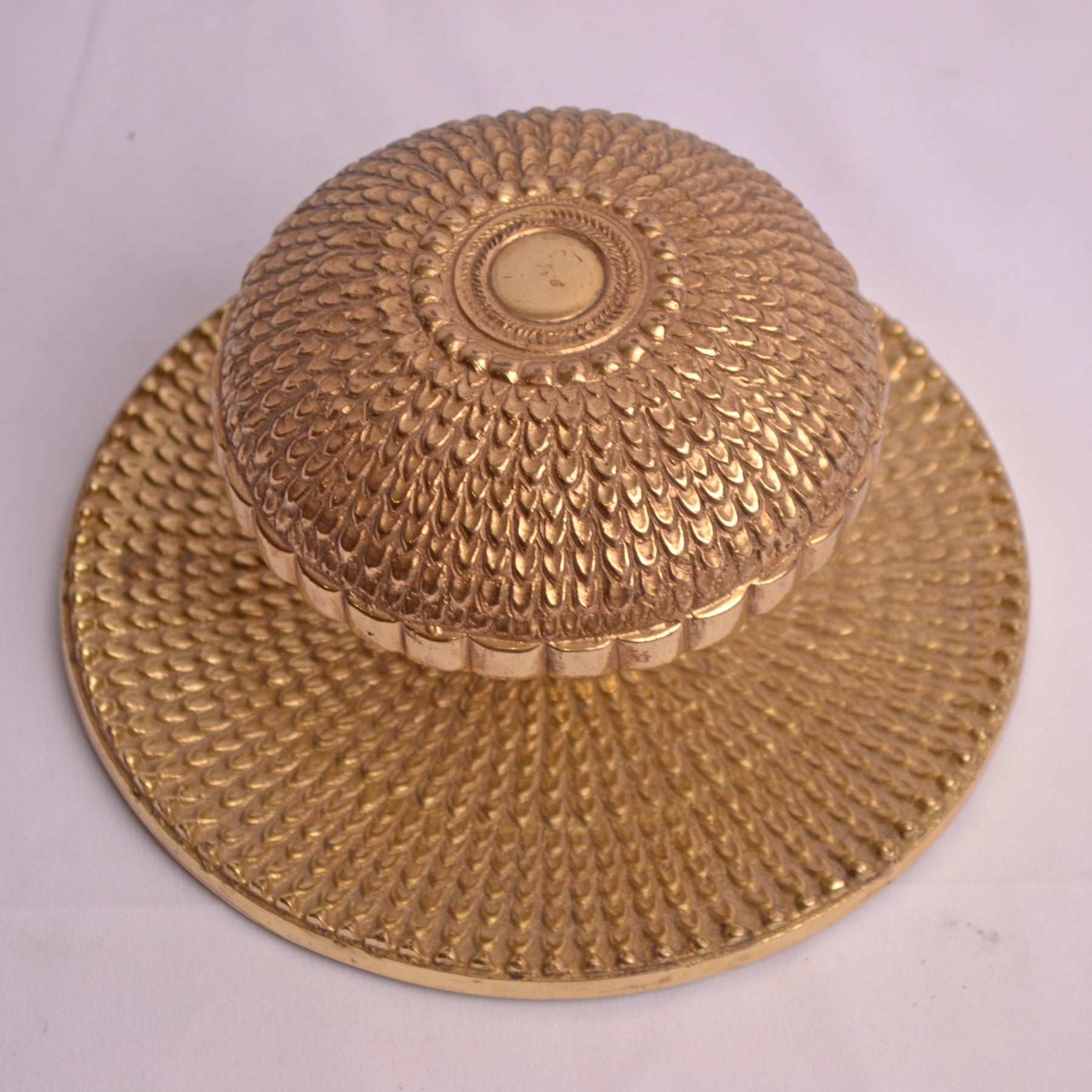 This Ormolu French Center Door Knob with back plate is made of solid brass. Ormolu is the term used to describe gilt brass on decorative art objects from the 18th and 19th centuries. This knob measures 4 1/2 inches in diameter with a projection of 3 1/4 inches. The back plate measures 6 /12 inches in diameter.