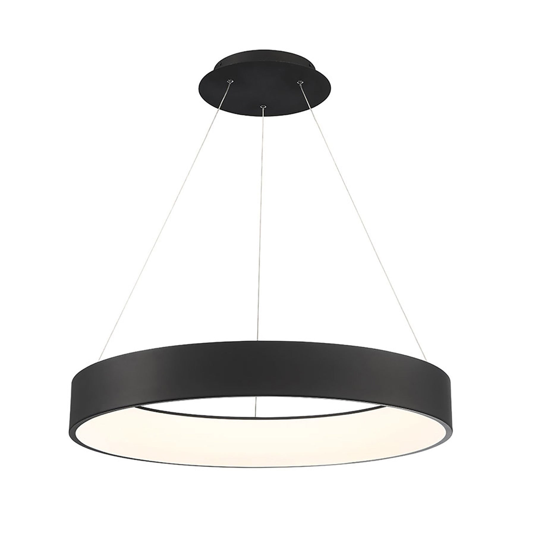 Corso 31.5in LED Pendant 3000K in Black. Cleverly hidden LED modules and a circular frosted diffuser floating inside a halo of spun aluminum work together for a beautiful, even illumination. Note the two new finishes—white and black—along with the original aluminum. Energy efficient integrated LED's provide a long-lasting maintenance-free bright and even illumination. 10ft of wire included to extend pendant up to a total of 120in, adjustable through a push-pin locking mechanism at the canopy. Solid aluminum construction with a white PC diffuser for maximum brightness and even illumination. Can be mounted on a slope ceiling. 10ft of wire included to extend pendant up to a total of 120in, adjustable through a push-pin locking mechanism at the canopy. Can be mounted on a slope ceiling. Driver is located in the round canopy. Universal Input Voltage Driver (120V-240V-277V). Custom CCT options available by special order. Smooth and continuous dimming with an electronic low voltage (ELV) or 0-10V dimmer. High Powered Replaceable LED Module CRI: 80, Rated Hours: 83,000, Color Temp: 3000K Standards: ETL & cETL UL 1598 listed for Damp Locations. CEC Title 24 Compliant.