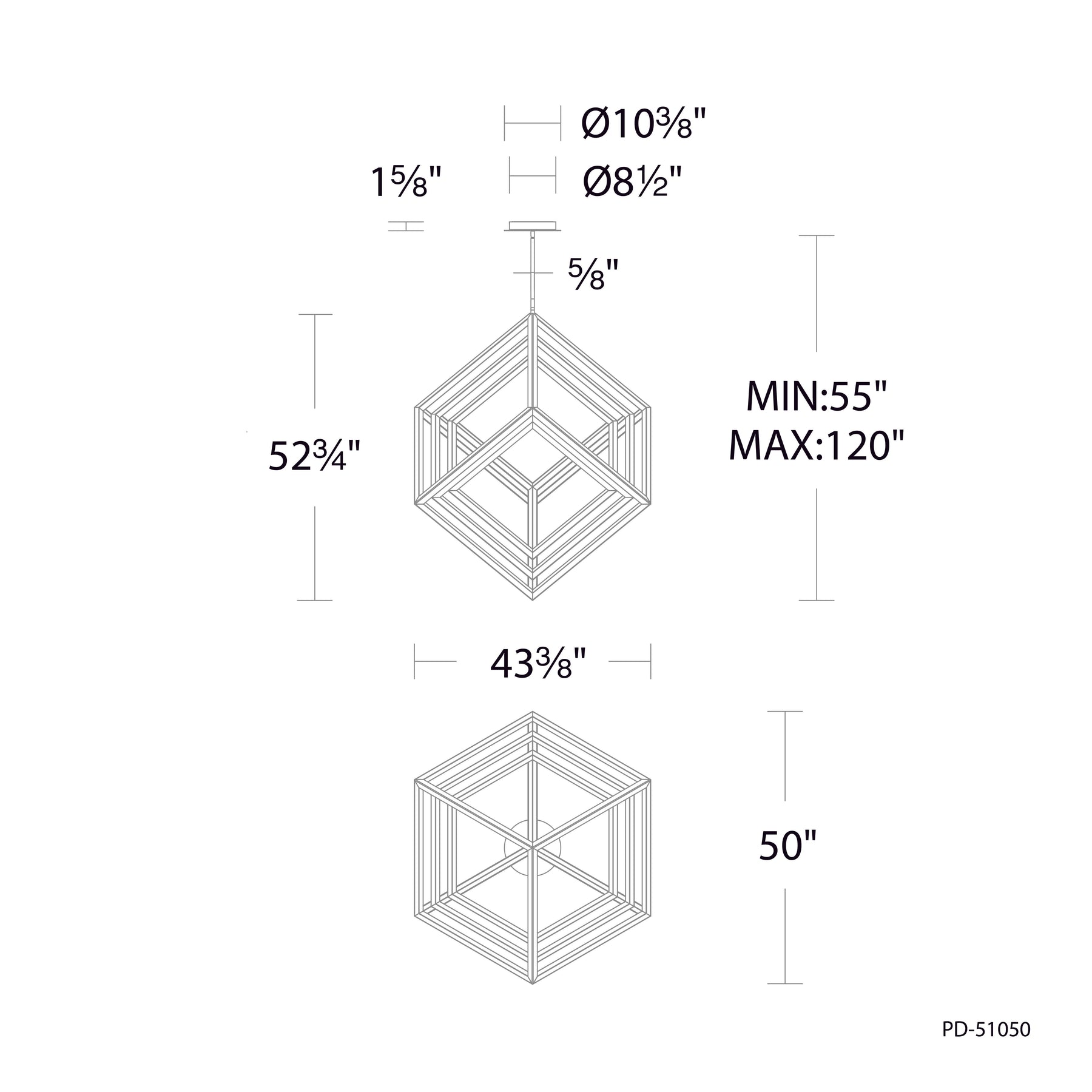 Atlas 40in LED Chandelier 3500K in Black. Reminiscent of the brilliant modern artwork of Eva Rothschild, this unique pendant features three illuminating cubes that move independently. The black finish provides striking contrast with the luminous lines of light. A recognizable bold design. Cubes rotate independently for creative display options. Stack all three cubes in the same direction for a stunning 3D cubed effect, or adjust independently for your own creative design. 10ft of wire included to extend pendant up to a total of 120in, adjustable through a push-pin locking mechanism at the canopy. Can be mounted on a slope ceiling. Driver is located in the round canopy. Universal Input Voltage Driver (120V-240V-277V) concealed within the canopy. Custom CCT options available by special order. Smooth and continuous dimming with an electronic low voltage (ELV), TRIAC, or 0-10V dimmer. High Powered Replaceable LED Module CRI: 90, Rated Hours: 50,000, Color Temp: 3500K Standards: ETL & cETL UL 1598 listed for Damp Locations.