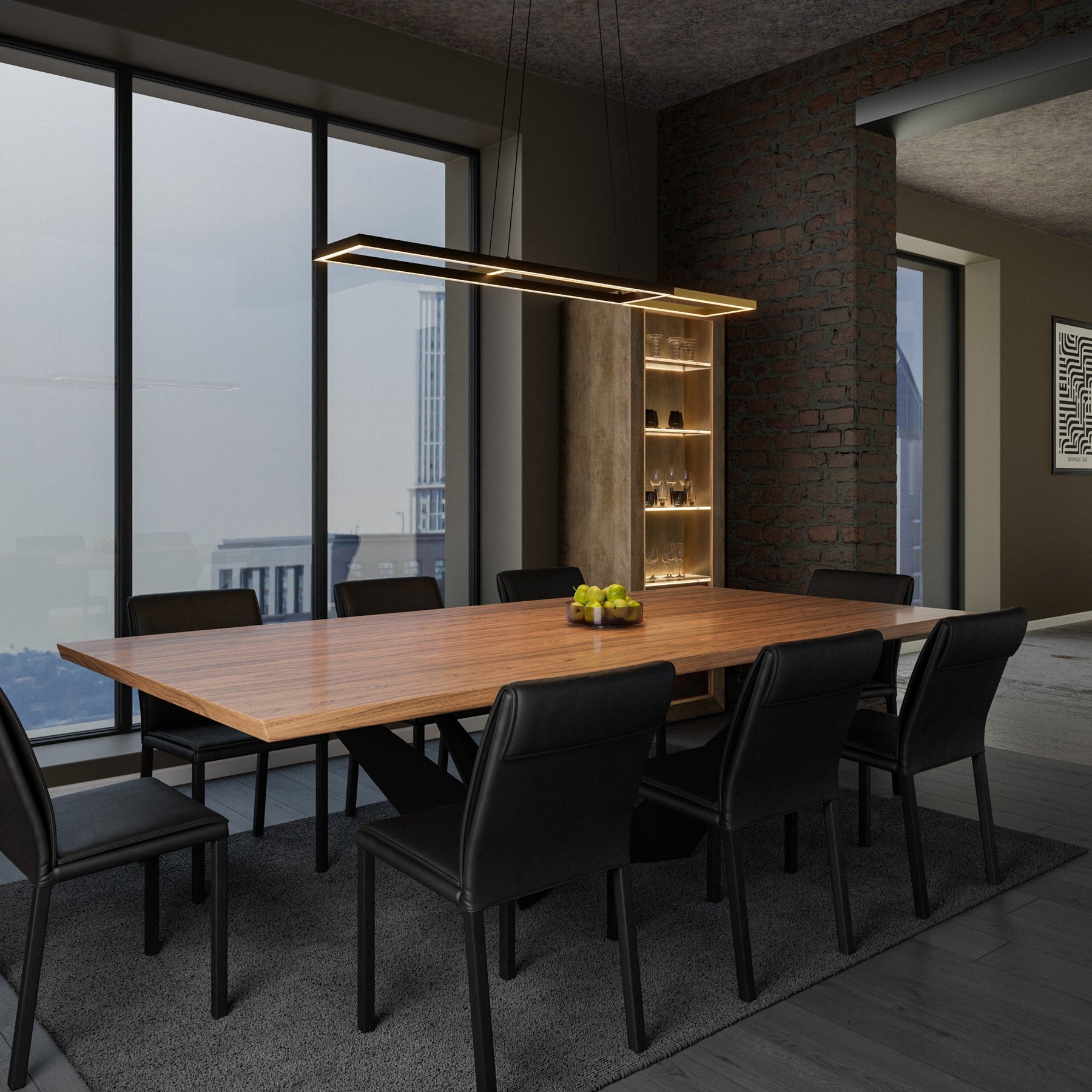 Double Entendre 42in LED Linear Pendant 2700K in Black Aged Brass. Double vision. The slim, dual-toned design of the airy rectangular framework floats effortlessly in mid-air while providing twice the amount of warm, LED down light. Featuring aluminum body construction with silicon diffusers Ultra-sleek electrified cable eliminates the need for clunky power wires. Height is simple to adjust through push pin connectors on the canopy. Sloped ceiling compatible. Universal Input Voltage Driver (120V-240V-277V) concealed in the canopy. Smooth and continuous dimming with an electronic low voltage (ELV) or TRIAC dimmer. High Powered Replaceable LED Module CRI: 90, Rated Hours: 50,000, Selectable Color Temp: 2700K-3000K-3500K-4000K Standards: ETL & cETL UL 1598 listed for Damp Locations.