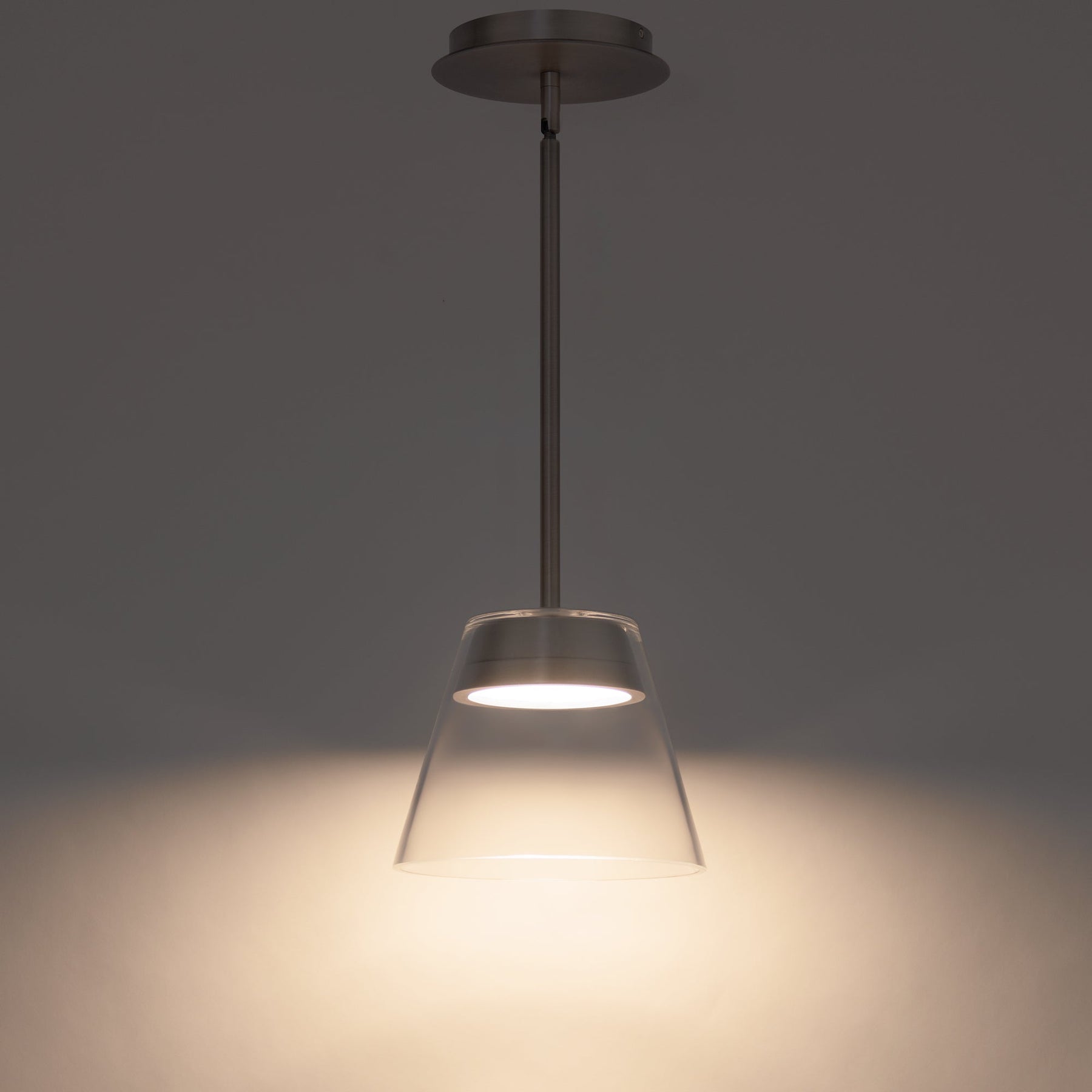 Chandra 7.5in LED Mini Pendant 3000K in Brushed Nickel. Chandra LED mini pendant from dweLED by WAC. This conical pendant features a slim minimalist body with a clear tapered thick wall and an aged brass or black downlight. Create a lovely design statement by grouping Chandra in a row over a kitchen island, counter, dining table or bar. This 14-inch mini LED pendant features a downlight with a clear glass shade. The CHANDRA style is also offered in a matching 8-inch size. Three 12 inch and one 6 inch down rods are included. A spin-on round canopy with minimal hardware can be mounted on a sloped ceiling. The Chandra LED Pendant uses ACLED driverless technology with a 3000K color temperature, high 90 color rendering index, and long lasting 50,000 hour rated life. Chandra operates on just 15 watts on a 120 volt system while delivering over 274 lumens and is California Title 24 rated to meet stringent energy savings standards. An aluminum body construction with a cone shaped clear glass shade provides wonderful downlight illumination. Chandra is damp location listed - can be used indoor or covered outdoor areas. 10ft of wire included to extend pendant up to a total of 120in. Includes 1x6in and 3x12in extension rods. Additional rods can be purchased separately for longer lengths. AC LED technology - no driver or transformer required. Easily fits on a pancake junction box. Sloped ceiling compatible. Smooth and continuous dimming with electronic low voltage ELV, or TRIAC dimmer options. High Powered Replaceable LED Module CRI: 90, Rated Hours: 50000, Color Temp: 3000K Standards: ETL & cETL UL 1598 listed with IP44 rating for Damp Locations. CEC Title 24 compliant.