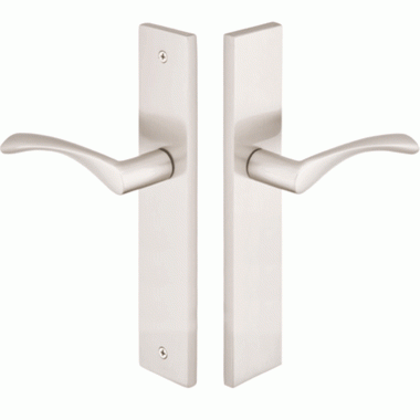 Solid Brass Euro Style Dummy Pair Multi Point Lock Trim (Brushed Nickel Finish) - The alluring Emtek piece of patio door hardware shown here features a beautiful brushed nickel finish. Measures 2 inches wide by 10 inches tall. Sold as a complete set, which includes plates, handles and cylinder. Multi point mortise lock box is not included. Trims only.