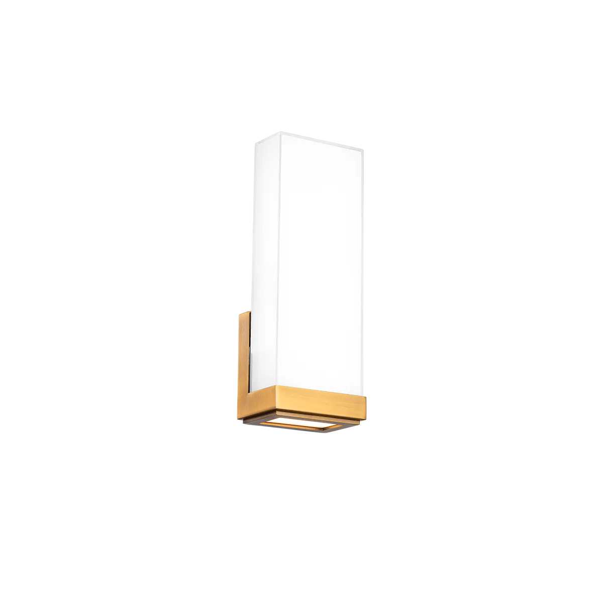 Coltrane 14in LED Wall Sconce 2700K in Aged Brass. A geometric monolith block of luminosity. Coltrane is a 14-inch indoor wall sconce with a clean silk screened, mitered cut tempered glass. When illuminated Coltrane is a real simplistic and eye catching design. Choose an aged brass or black finish to complete your design. Energy efficient integrated LED's provide a long-lasting maintenance-free bright and even illumination. This ADA compliant, low profile design makes the Coltrane collection a great choice in upscale hospitality or residential homes. NEW: Tri-CCT technology features a switch inside the canopy that is accessible during installation and allows you to toggle color temperatures between 2700K Warm - 3000K Warm White - 3500 White to find and set the perfect color temperature for your space. This fixture is factory pre-set to a default 3000K setting for consistency and can be modified in the field during installation. White ceramic silk-screened miter cut glass adorns die cast hardware and conceals energy efficient integrated LED's providing a long-lasting maintenance-free bright and even illumination. Coltrane provides an ambient outward and downward illumination. NEW Tri-CCT technology features a switch inside the canopy that is accessible during installation and allows you to toggle color temperatures between 2700K Warm - 3000K Warm White - 3500 White to find and set the perfect color temperature for your space. This fixture is factory pre-set to a default 3000K setting for consistency and can be modified in the field during installation. Universal Voltage driver (120V-220V-277V) is concealed in the canopy. Smooth and continuous dimming with an electronic low voltage (ELV) or TRIAC dimmer. High Powered Replaceable LED with CRI: 90, Rated Hours: 60,000, Color Temp: 2700K-3000K-3500K Adjustable Standards: ETL & cETL UL 1598 listed for Damp Locations. CEC Title 24 Compliant, and ADA Compliant.