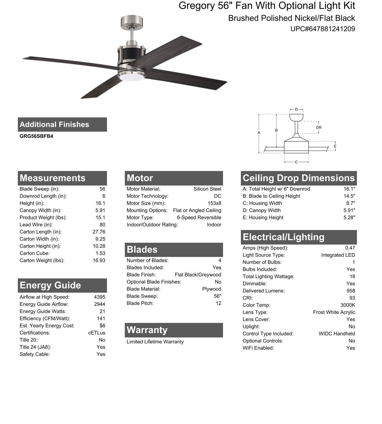 The Gregory 56" Smart ceiling fan blends handsome good looks, performance and the convenience of Wi-Fi functionality. Featuring a quiet energy saving 6-speed, reversible DC motor, set of four reversible custom blades, integrated dimmable LED white frost light kit with optional lens cover included, the Gregory fan is easily controlled with either the included remote controls or the integrated Wi-Fi featuring breeze and timer functions compatible for use with most smart home devices, smart phones and systems with no additional hub needed.