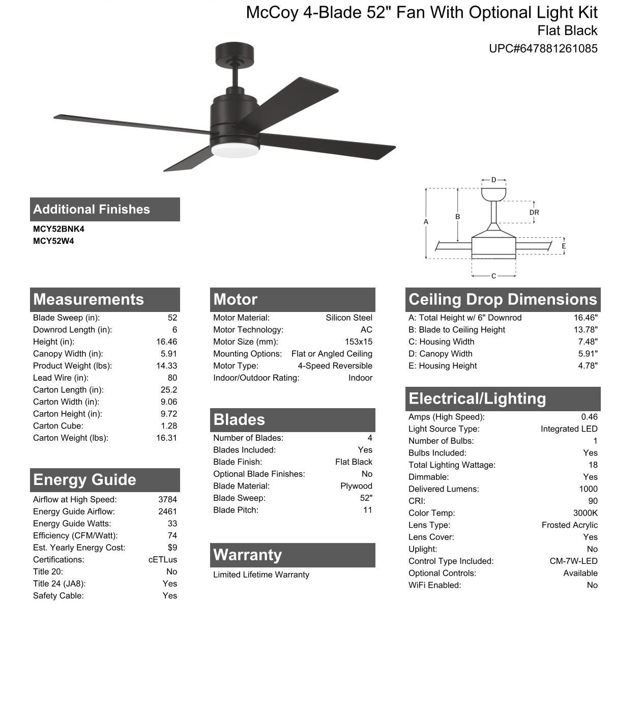 Looking for universal style and strong performance? The McCoy 52" 4 Blade ceiling fan by Craftmade is the real deal. The McCoy features a clean cylinder body, custom four blades, dimmable 18W LED Light with an optional lens cover included, and hardwired wall control that ensures perfect performance.