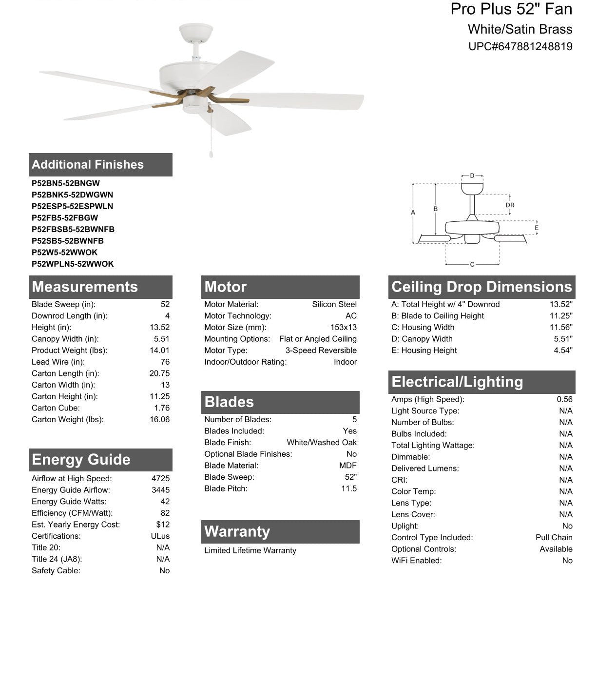 The ideal combination of excellent performance, exceptional value and timeless style, the Craftmade Pro Plus 52" ceiling fan featuring a clean motor, updated straight blade arms and canopy is built for performance. The dual mount, 3-speed, reversible fan includes custom 52" reversible blades. Optional light kits and remote controls are available(Sold Separately).
