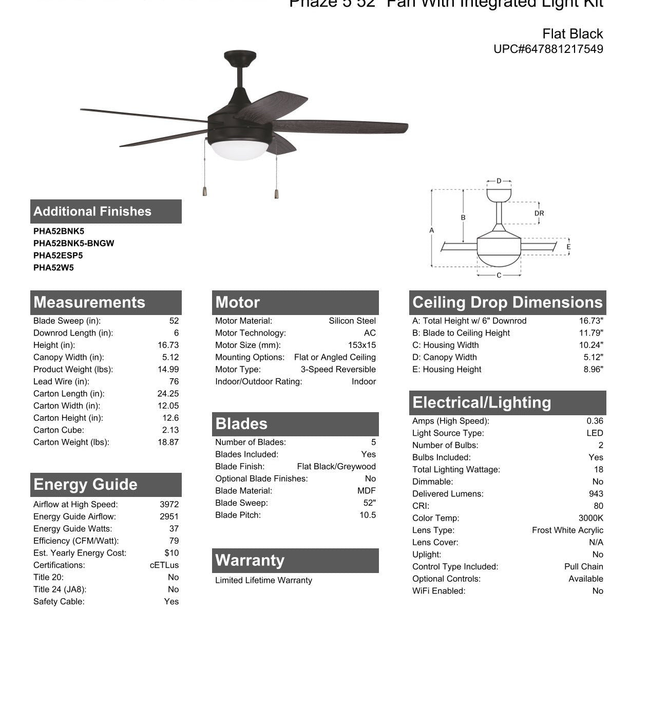 Modern and minimalist, the Phaze 5 52" features a sleek five blade design powered by a 3-speed, reversible motor, integrated lighting with non-dimmable LED bulbs included.