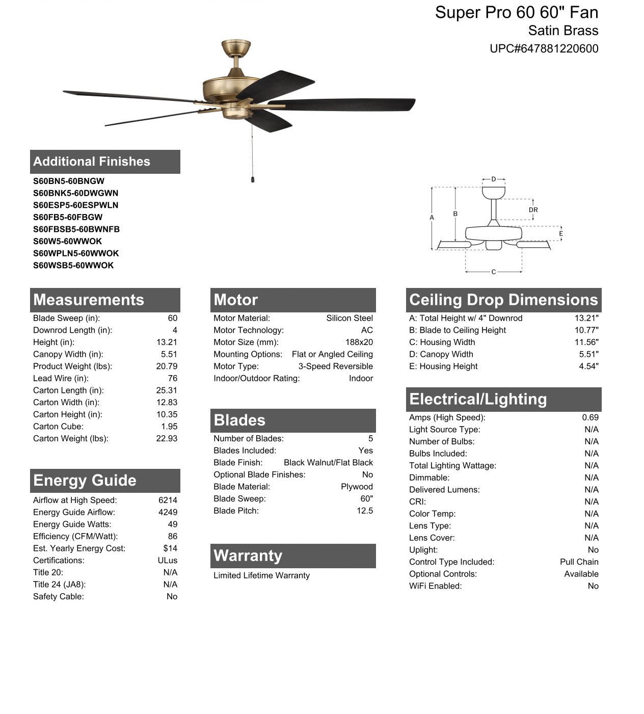 The ideal combination of excellent performance, exceptional value and timeless style, the Craftmade Super Pro 60" ceiling fan featuring a clean motor, updated straight blade arms and canopy is built for performance. The dual mount, heavy-duty, 3-speed, reversible fan includes custom 60" reversible blades. Optional light kits and remote controls are available(Sold Separately).