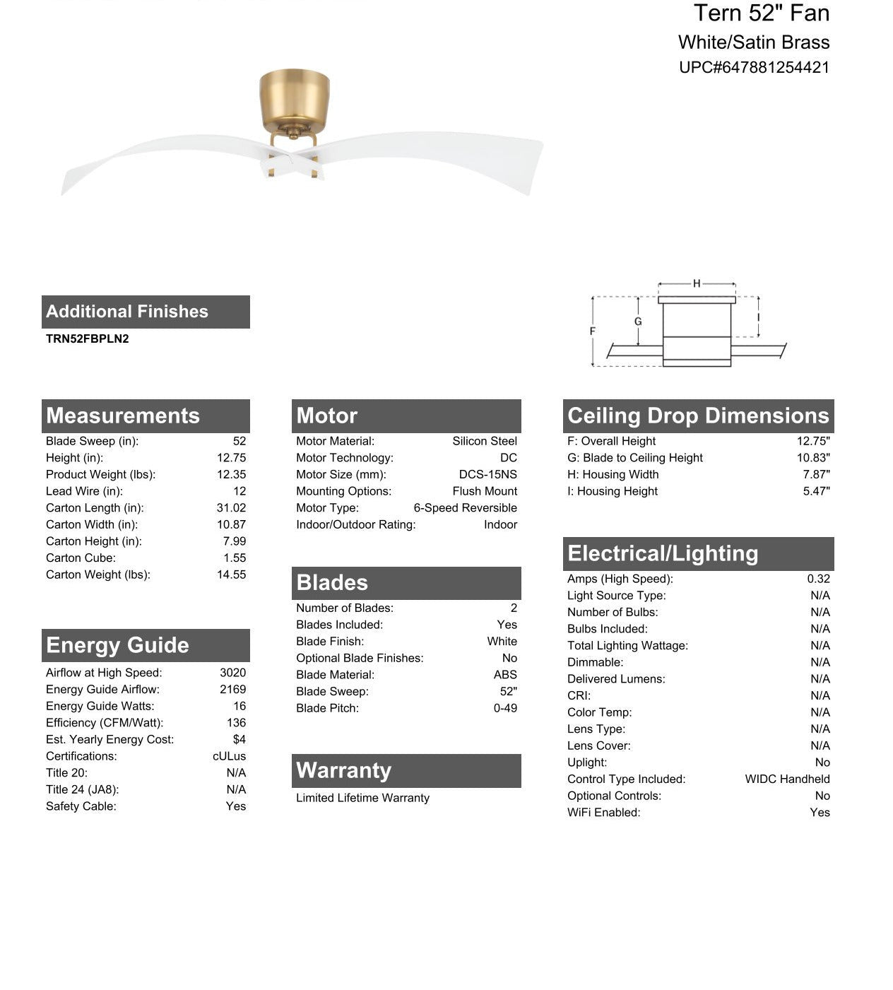 Soar into high style with the Tern 52" ceiling fan featuring two interlocked curved ABS blades suspended from an sleek tapered canister enhanced with the convenience of a Wi-Fi enabled, energy saving, 6-speed reversible DC motor that can controlled using the included handheld remote control or through the integrated Wi-Fi feature using the Bond app which allow access to additional functions including voice control, breeze, and timer functions compatible for use with most smart home devices, smartphones, and systems with no additional hub needed. Not light kit adaptable.