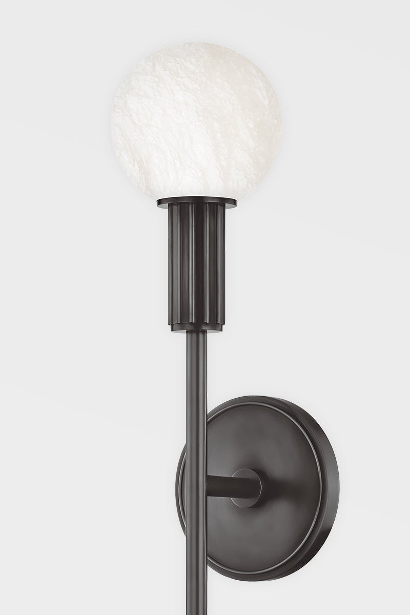 The Murray Hill Wall Sconce by Hudson Valley Lighting features a stunning alabaster shade in white, providing elegant illumination for your space. With a height of 22.00 inches, a width of 4.50 inches, and an extension of 5.00 inches, this sconce is designed to enhance your decor without overwhelming it. It is equipped with a G9 socket that supports a recommended G9 LED bulb with a wattage of 4.00, ensuring energy efficiency. The fixture is available in Aged Brass and Distressed Bronze finishes, and it is UL Damp rated, making it a suitable choice for use in humid areas such as bathrooms.
