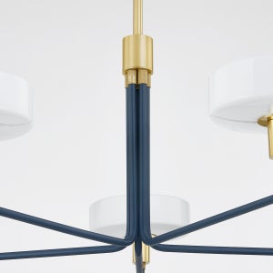 The Aston Collection by Mitzi showcases a stunning five-light chandelier that combines elegance with modern design. With a width of 39.00 inches and a height of 14.75 inches, this chandelier is perfect for making a statement in any room. It features a beautiful glass shade that diffuses light warmly, and is designed to accommodate five E12 candelabra base bulbs (not included) with a maximum wattage of 8W each. The aged brass and slate blue finish adds a touch of sophistication, while the UL Damp rating makes it suitable for use in areas with higher humidity.