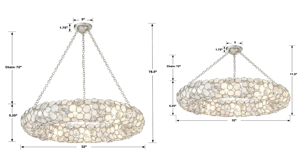 The Palla Ring chandelier is fitted with different sized round, hand-pinned, organic, and naturally textured Capiz shells, creating a unique texture and sparkle that play with the interplay of light and shadow. Faceted cut crystal jewels nestled within overlapping metal circles offer depth and dimension, elevating the chandelier into a work of art. Its open-ring design at the top directs light upward, creating a warm and inviting ambiance, and casts a gentle, downward glow. The same enchanting Capiz shells and crystal details that grace the fixture are mirrored on the canopy, ensuring that every aspect of the Palla Ring Chandelier exudes a sense of organic luxury and sophistication.