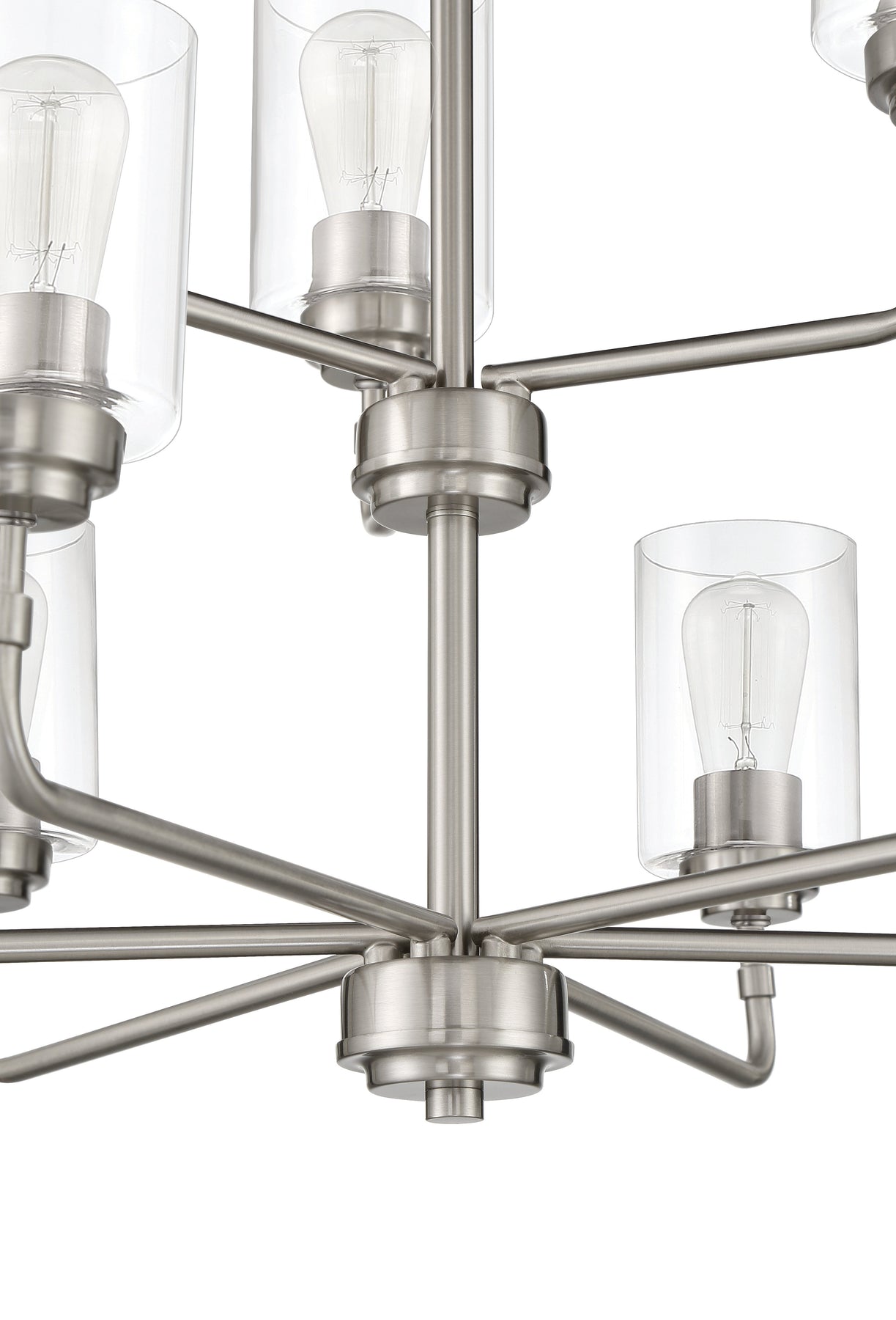 The Stowe 9 Light Chandelier in Brushed Polished Nickel is a refined lighting fixture that enhances any indoor space with its elegant design. This chandelier requires nine medium base A19 bulbs at a maximum wattage of 60W each (bulbs not included). It features a substantial depth and width of 30 inches, with a height of 19.75 inches, and is equipped with 3 x 12 inch and 1 x 6 inch downrods for adjustable mounting. The fixture also includes a leadwire length of 120 inches and a canopy measuring 5 x 5 x 0.79 inches. With its clear glass accents and a safety rating of cULus, the Stowe chandelier combines both style and safety for a warm, inviting atmosphere.