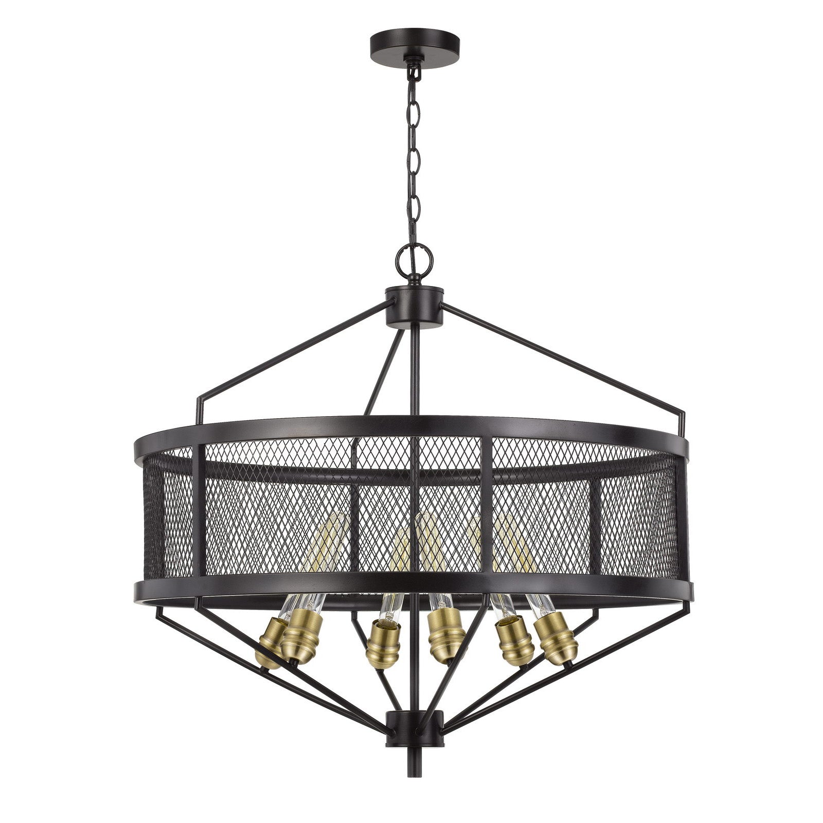 The FX-3743-6 Halle Metal Chandelier is a stunning lighting fixture that combines antique brass and black finishes for a sophisticated touch. Designed to accommodate six E26 base bulbs (not included), it supports a maximum wattage of 60W per bulb. The chandelier features a unique drum mesh metal shade that adds character while allowing for optimal light distribution. With package dimensions of 32.50 inches in length, 32.50 inches in width, and 19.30 inches in height, this chandelier is perfect for grand spaces, creating a warm and inviting atmosphere. Assembly is required, and it comes with a one-year warranty against defects in material and workmanship.