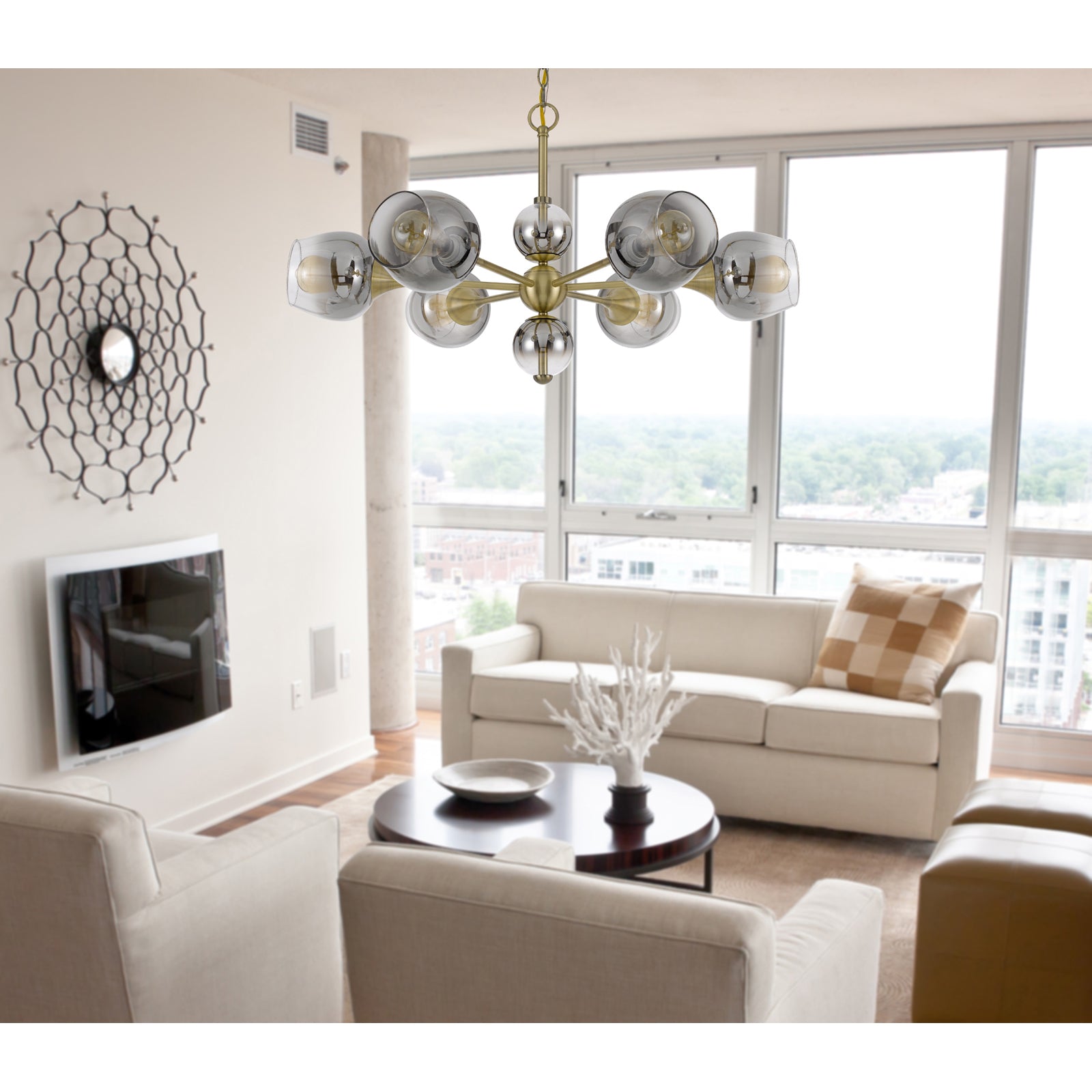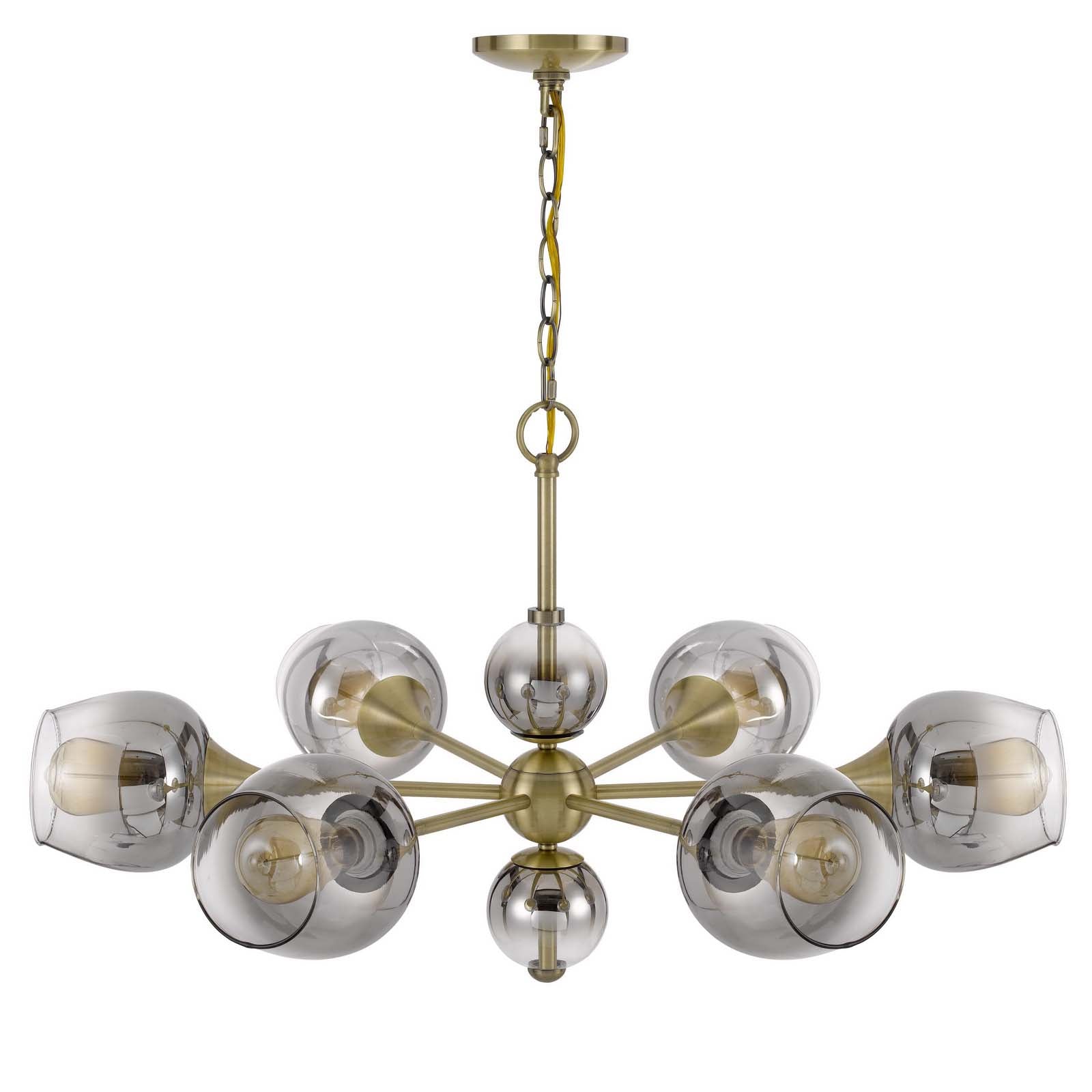 60W X 6 PENDLETON METAL CHANDELIER WITH ELECTORAL PLATED SMOKED GLASS SHADES