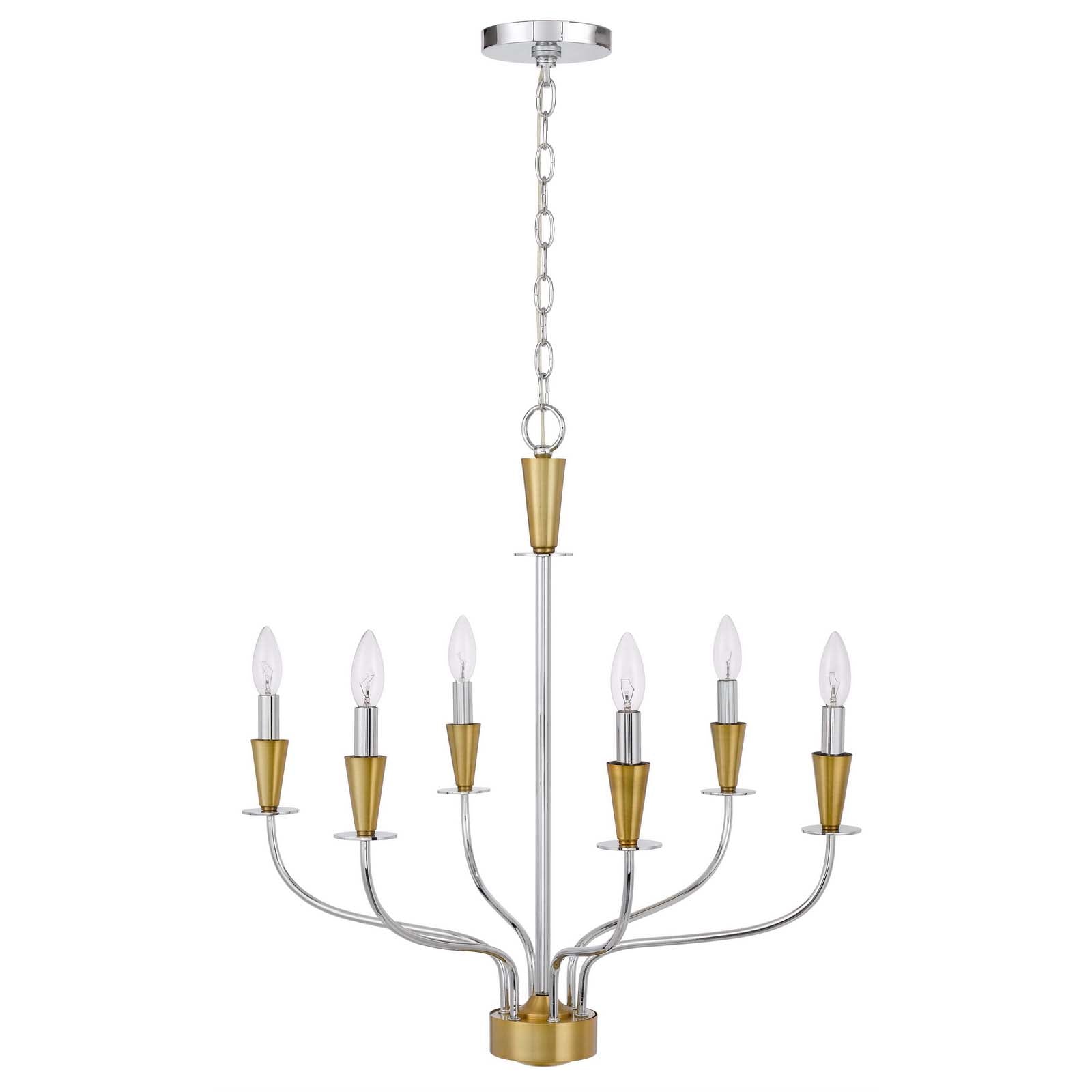 The FX-3763-6 Weston metal chandelier is a stunning addition to your home, perfect for illuminating your dining room. This elegant candelabra style chandelier features a wide taper candle design with striking gold accents and a geometric layout. It boasts a stylish chrome/satin brass finish and is constructed from durable metal for long-lasting use. Standing at 26 1/4 inches high, this chandelier requires six E12 base bulbs with a maximum wattage of 60W each (not included). With careful attention to detail, it's designed to brighten any space while adding a touch of sophistication.