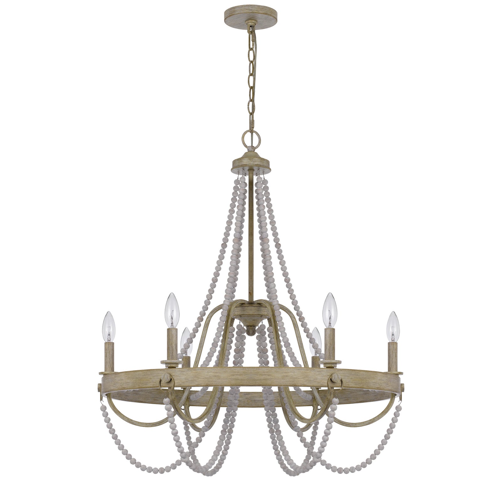 The FX-3790-6 Macon Beaded Metal Chandelier is a stunning addition to any French country-inspired decor. This chandelier boasts a durable metal construction with a traditional candelabra design, featuring six lights that each accommodate an E12 base bulb with a maximum wattage of 60W. The white wash beaded accents and light brown wood frame enhance its charm, while the distressed finish adds character. Measuring 30.80 inches in length, 12.50 inches in width, and 30.30 inches in height, this chandelier includes a canopy and a 6-foot chain for versatile hanging options. Assembly is required, and it comes with a one-year warranty, ensuring its quality and longevity.