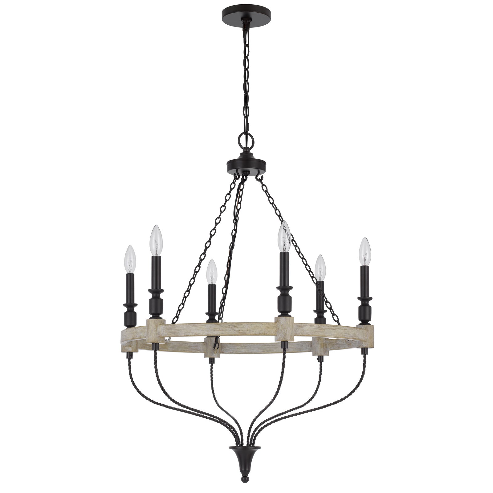 The FX-3793-6 Grove metal chandelier is a stunning centerpiece for your home, featuring a durable metal construction and a charming french country design. With six uplight candelabra-style bulbs (E12 base, 60W max) housed within a distressed wood wheel frame, this chandelier exudes rustic elegance. It comes in a sleek satin black finish and includes a canopy, 6-foot chain, and 10 feet of electrical wiring, providing versatile installation options. Assembly is required, and it typically ships within 3 business days, backed by a one-year warranty against defects in material and workmanship.
