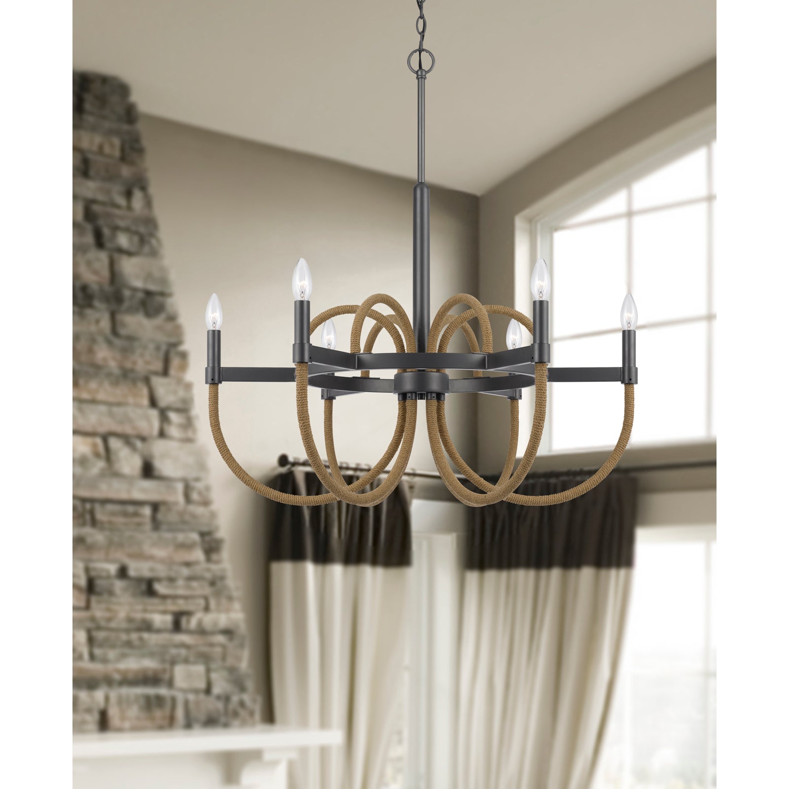 The Rowland 60W x 6 Metal/Burlap Roped Chandelier combines contemporary design with classic candelabra style, making it an ideal centerpiece for any room. This hardwired fixture includes six lights with E12 bulb bases, supporting a maximum wattage of 60W per bulb. Crafted from durable metal with braided burlap accents, it is both chic and sturdy. The chandelier features a 72-inch dark bronze chain for hanging and ships in one carton, complete with a canopy. Minor assembly is required, and it comes with a one-year warranty, ensuring peace of mind for your lighting choice.